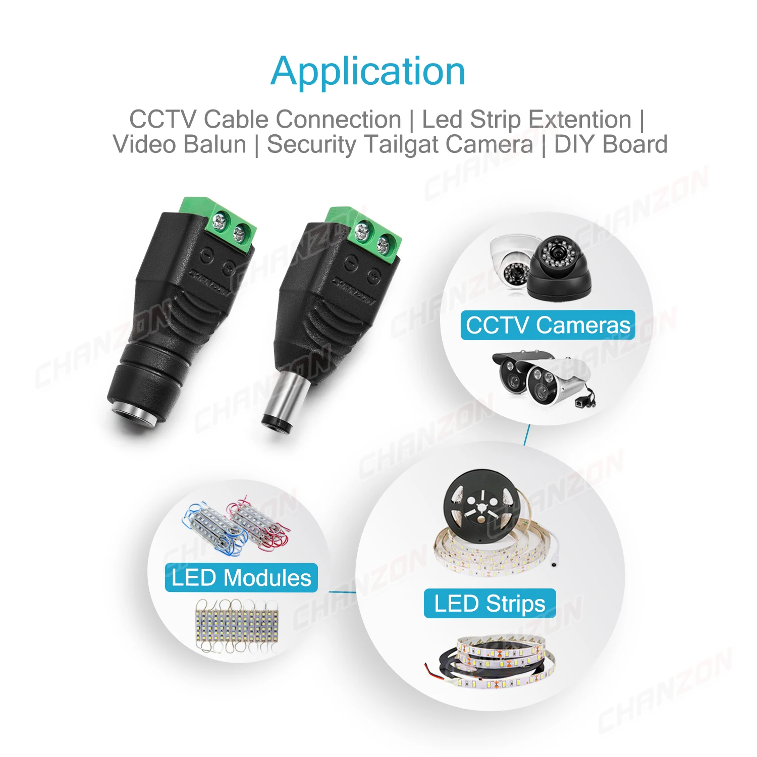 - Applications: bandes LED, système de caméra de sécurité, caméra CCTV, appareil ménager, connexion CC à l’aide etc.