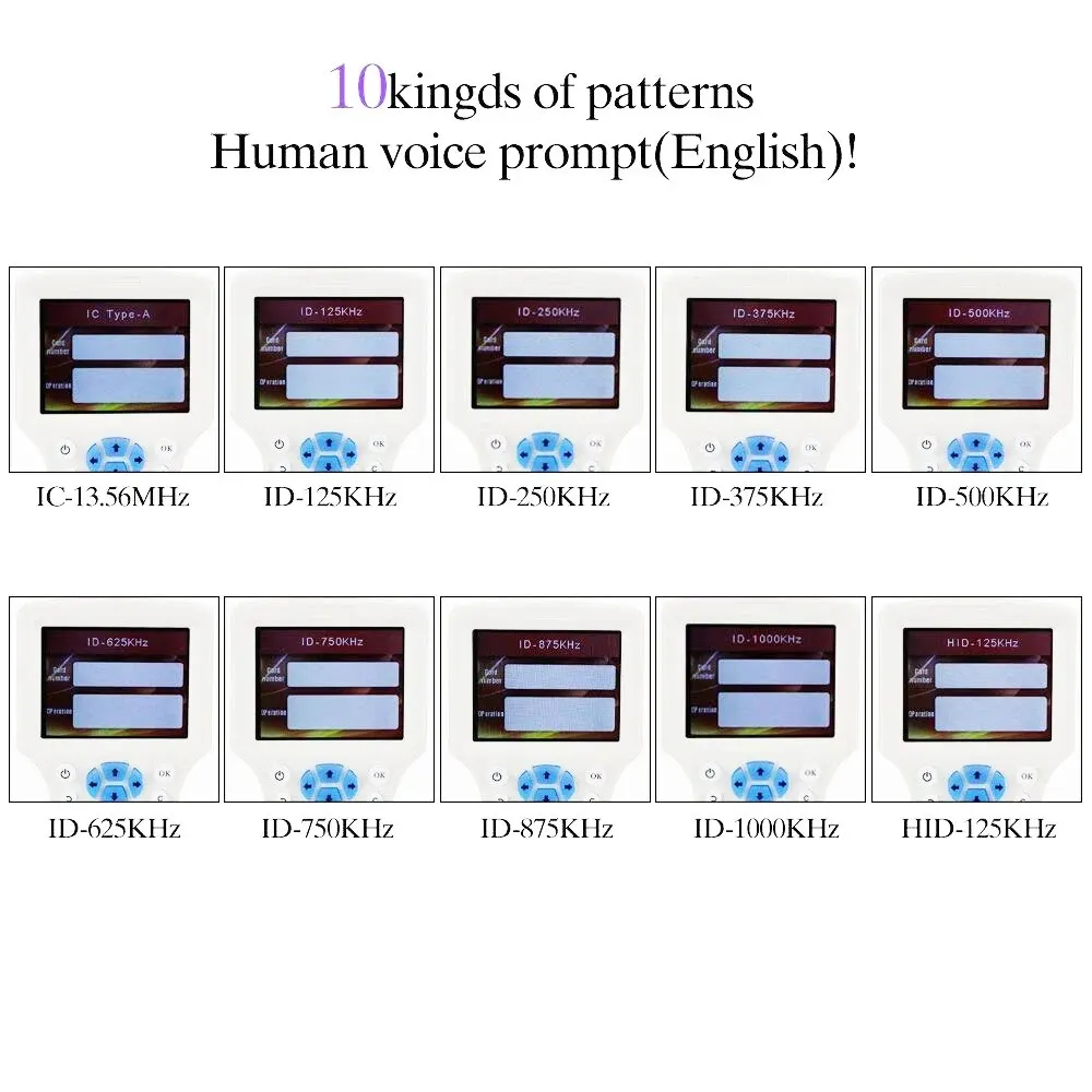- Supporte la fréquence de lecture et d’écriture: 125KHz, 175KHz, 250KHz, 300KHz, 375KHz, 500KHz, 625kHz, 750kHz, 875KHz, 1000KHZ, 13.56MHz (ISO1443A/B), prend en charge la carte HID Prox.