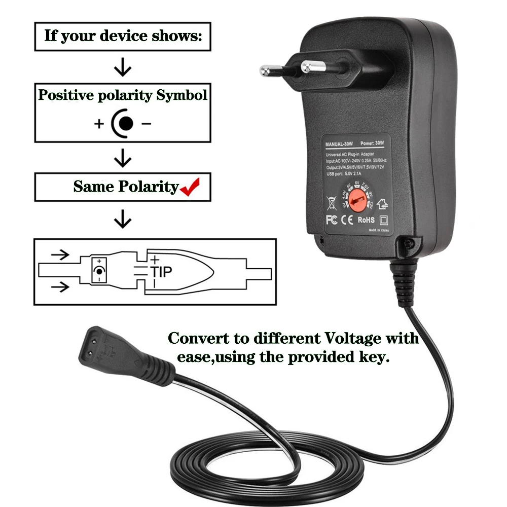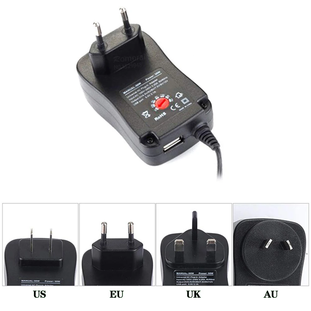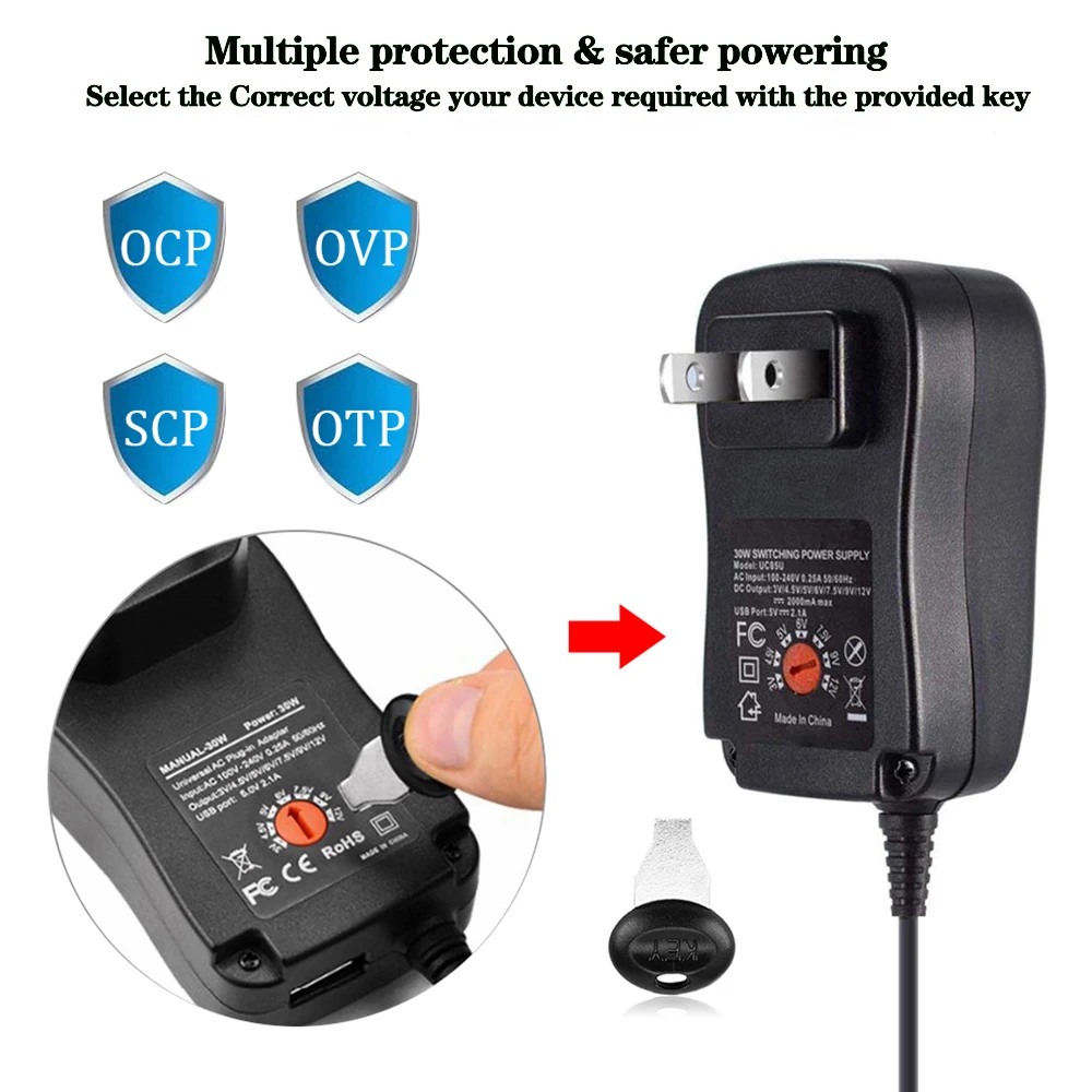 L’adaptateur d’alimentation de 30W avec 9 têtes de rechange est une solution pratique et polyvalente pour alimenter divers appareils électroniques. Il offre une plage de tensions réglables de 3V à 12V, avec des intensités de 2A à 2.1A. Il est compatible avec les prises US, EU, UK, et AU.