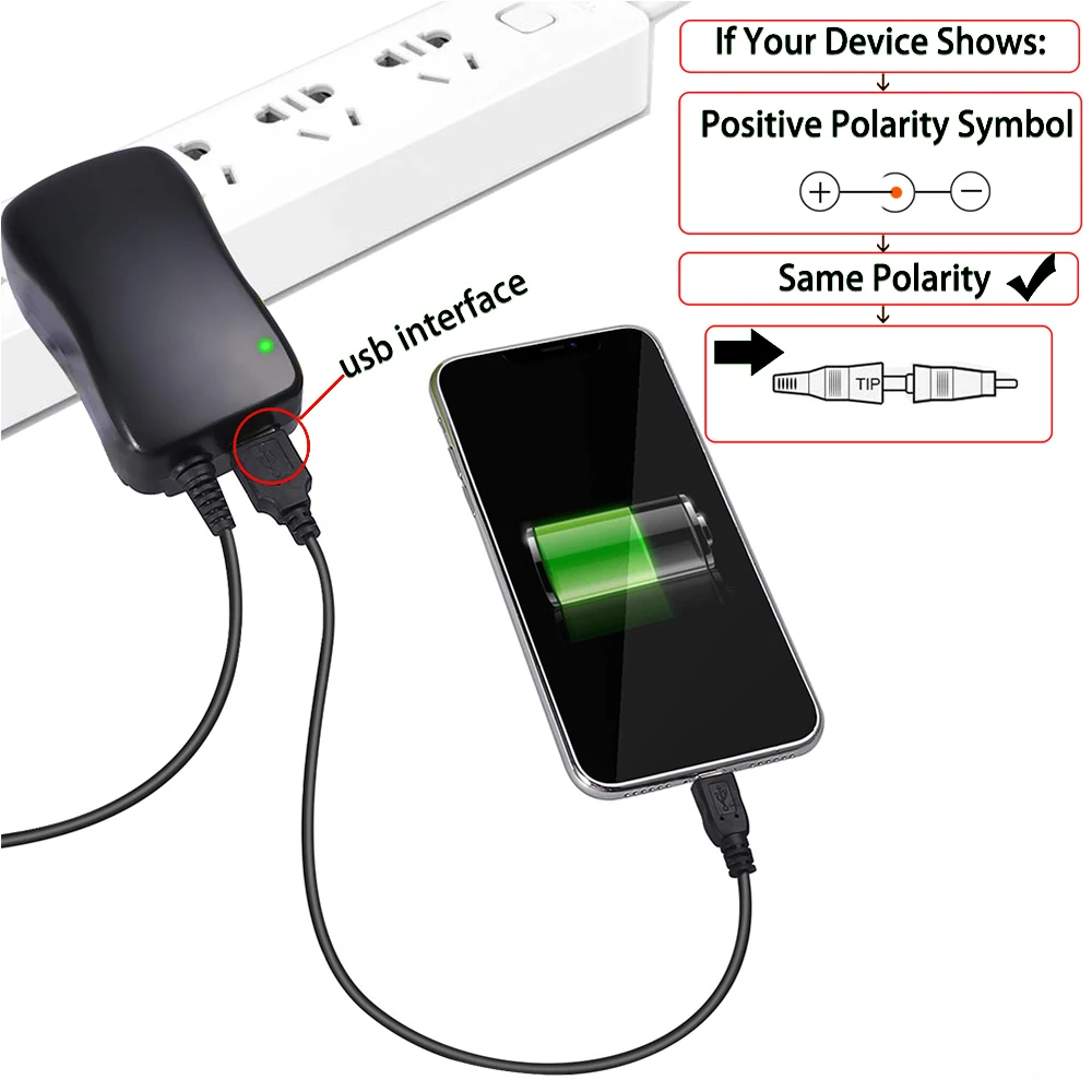 Réponse: Vérifiez le symbole de polarité près de l’autocollant de spécification de l’appareil ou du port d’alimentation. Notre extrémité d’adaptateur et nos embouts de cordon ont le symbole de polarité, la même connexion de symbole est le réglage de polarité correct.