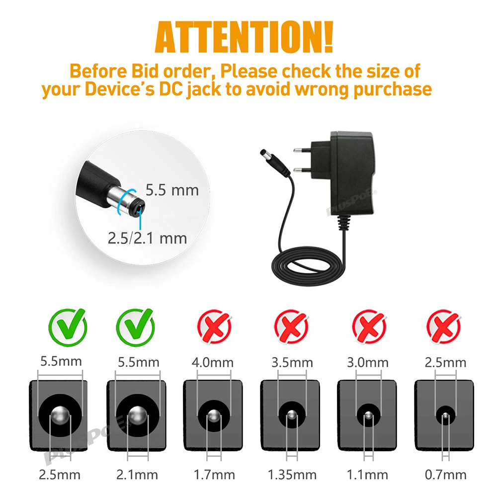 | 100-240V 50/60H | 3V, 4.5V, 5V, 6V, 7.5V, 8V, 9V, 10V, 12V, 15V, 24V | Carte physique | 5.5mm * 2.1mm-2.5mm | Noir | Interne positif, externe négatif |