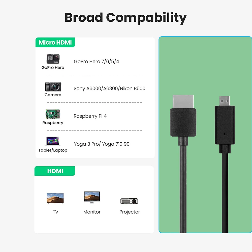 Le câble Micro HDMI vers HDMI 2.0, 4K 60Hz est un excellent choix pour connecter une tablette ou d’autres appareils mobiles à un écran HD. Sa large compatibilité avec différents appareils tels que les GoPro, les appareils photo Sony et Nikon, les Raspberry Pi et les ordinateurs portables Lenovo en fait un câble polyvalent.