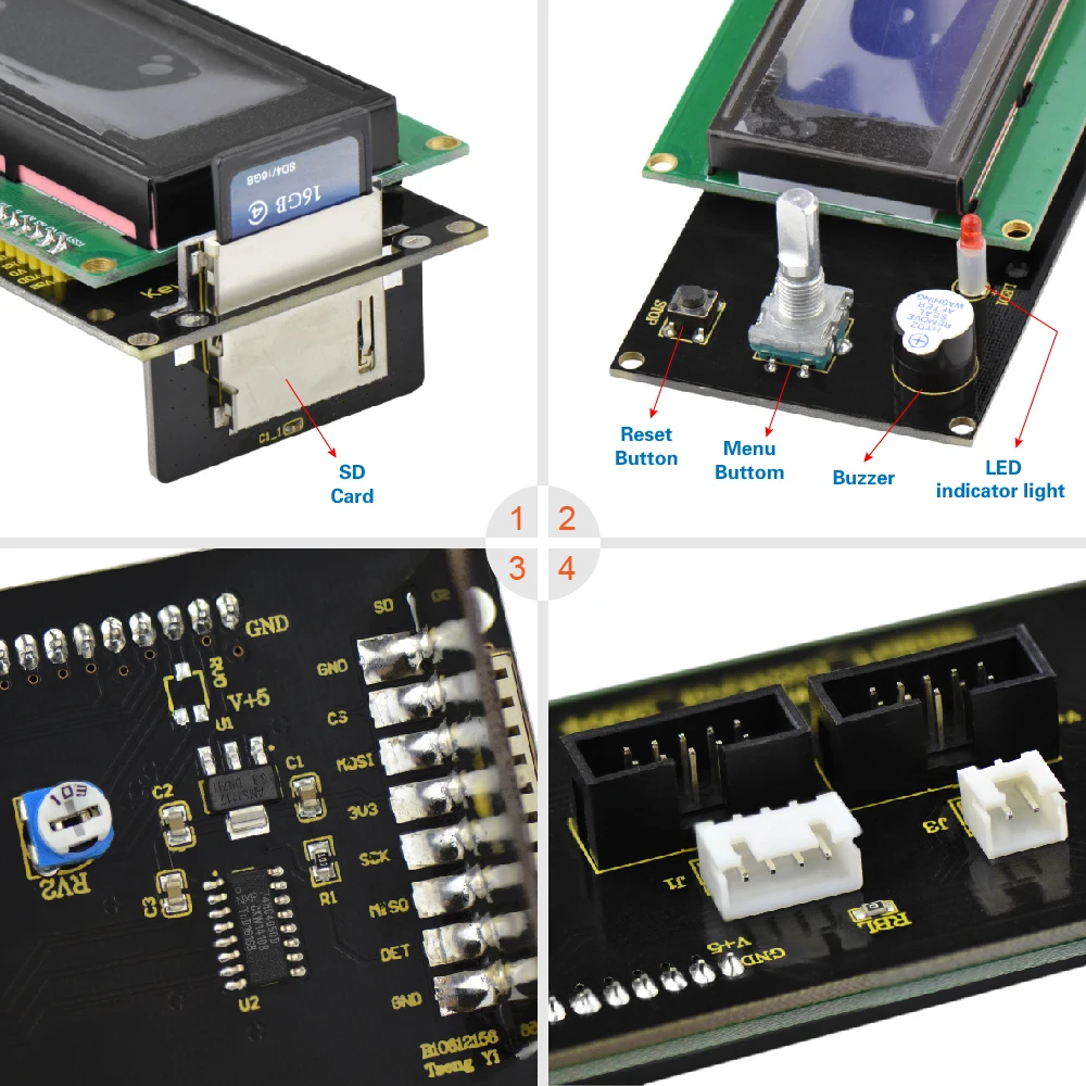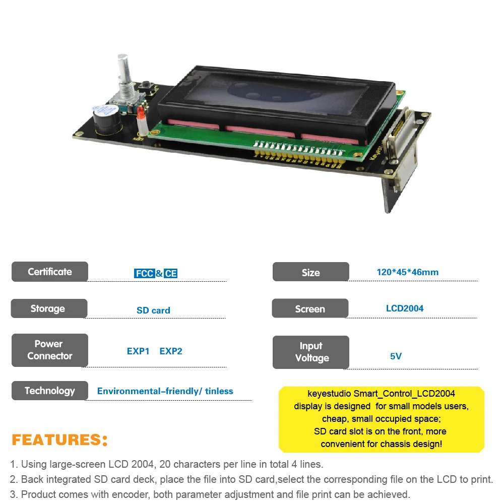Le module Keyestudio LCD2004 3D comprend un lecteur de carte SD, un encodeur rotatif et un écran LCD 20 caractères * 4 lignes. Ce panneau de contrôle intelligent peut être connecté à RAMPS 1.4, ce qui permet d’imprimer des conceptions 3D sans PC. En ajustant l’encodeur rotatif sur le panneau Smart Control, vous pouvez effectuer des actions telles que le calibrage et les mouvements des axes. Grâce au design g-code stocké sur la carte SD, l’impression de vos conceptions 3D devient simple et pratique.