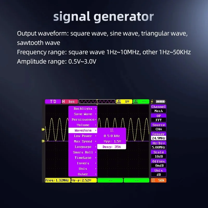 L’oscilloscope DS100 est un outil de test portable très pratique et rentable dans le domaine de la maintenance et de la recherche en électronique. Il offre un taux d’échantillonnage en temps réel de 250MSa/s, une bande passante de 50M et des fonctions de déclenchement complètes (simples, normales et automatiques).