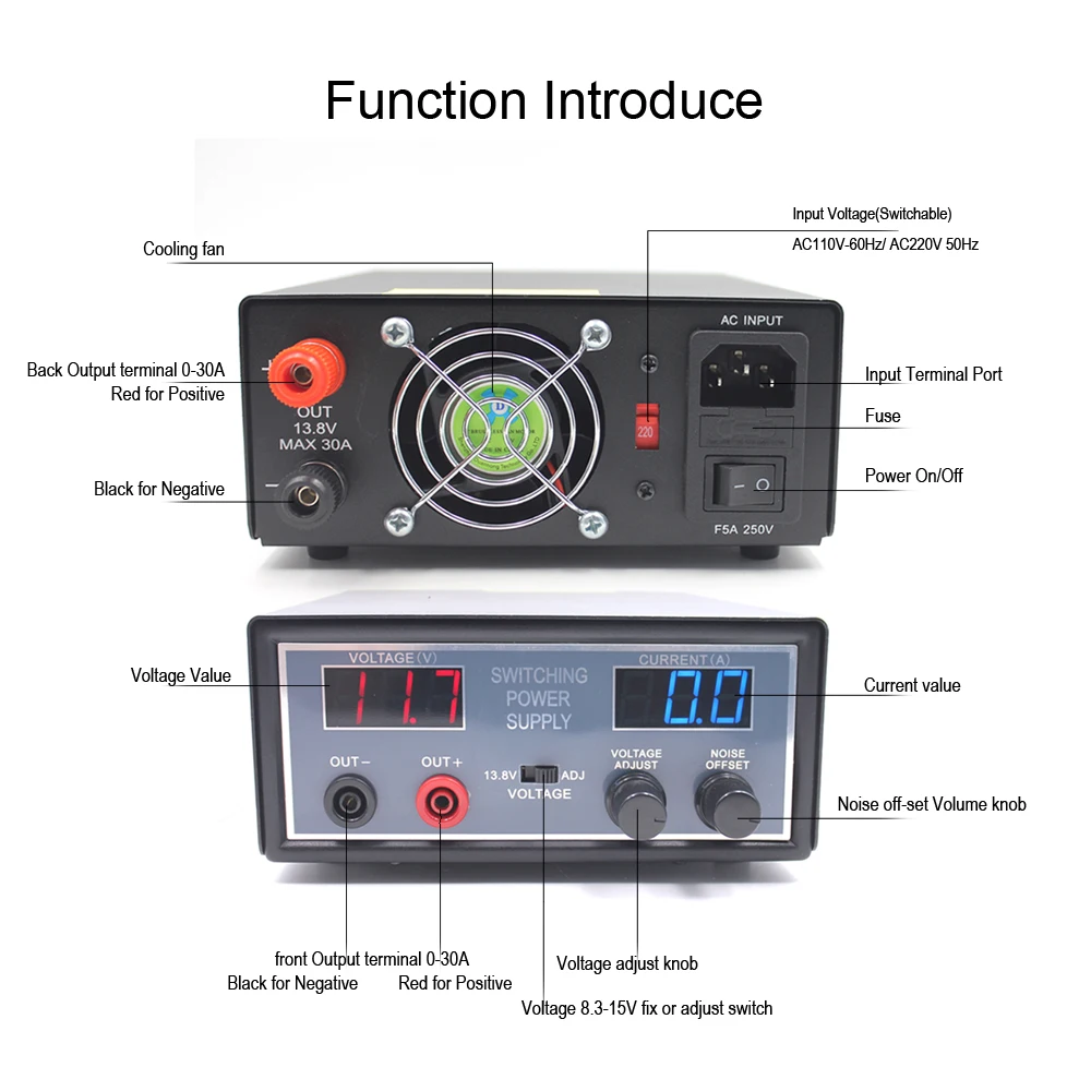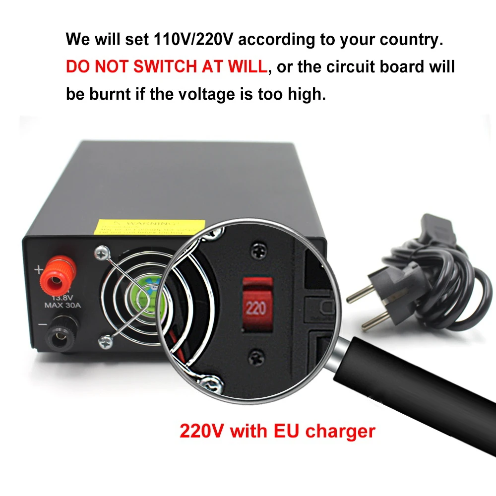 • Tension de sortie: 13.8VDC (ajuste la tension entre 9.0 et 15.0 volts)