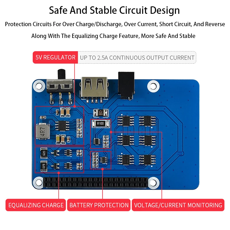 CaractéristiquesUPS HAT pour Raspberry Pi, alimentation sans coupure 5V, circuits de protection multi-batteries