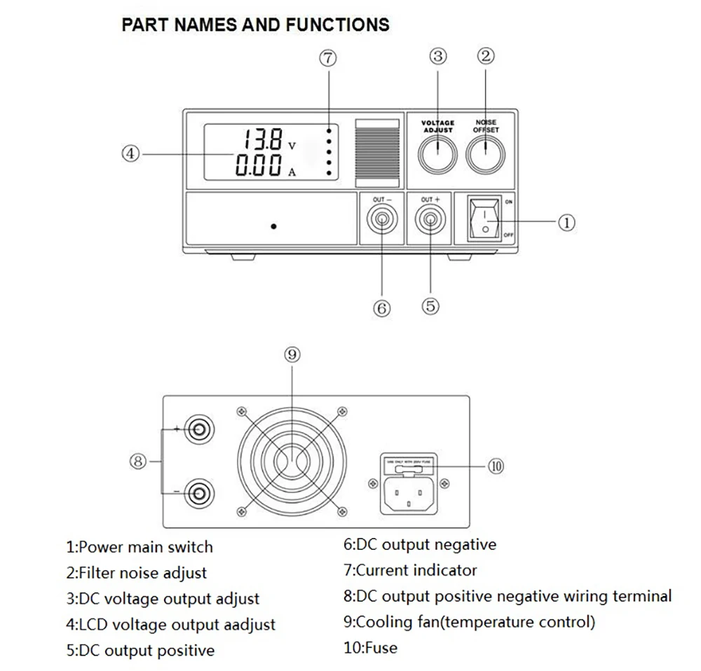 - Tension de sortie : 13.8VDC (réglable entre 9.0 et 15.0 volts)