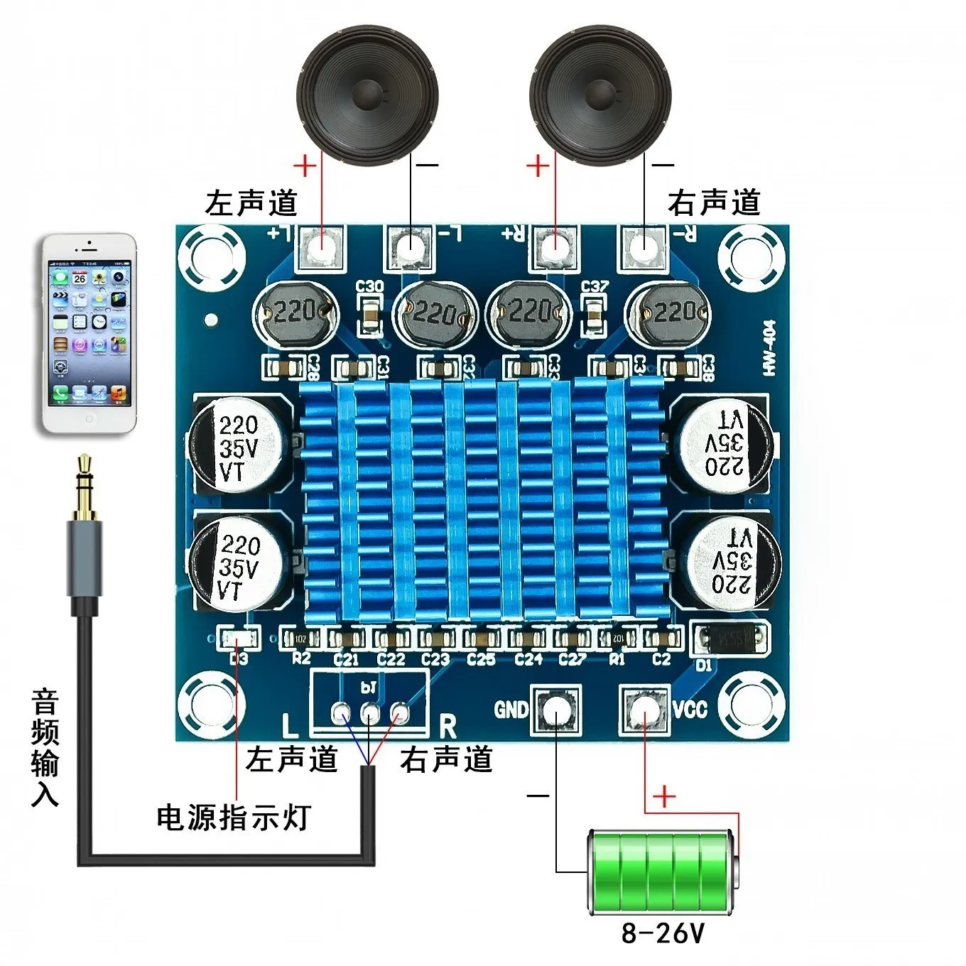 La tension d’alimentation de cet amplificateur est de DC8V-26V.