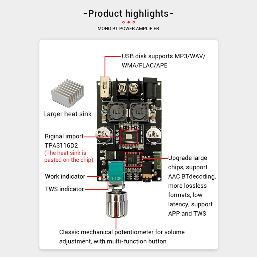 Cet amplificateur utilise la puce TPASION Witches, qui permet un décodage Bluetooth AAC et prend en charge de nombreux formats audio sans perte. Il offre une faible latence et prend également en charge l’APP et le TWS pour une expérience d’écoute améliorée.