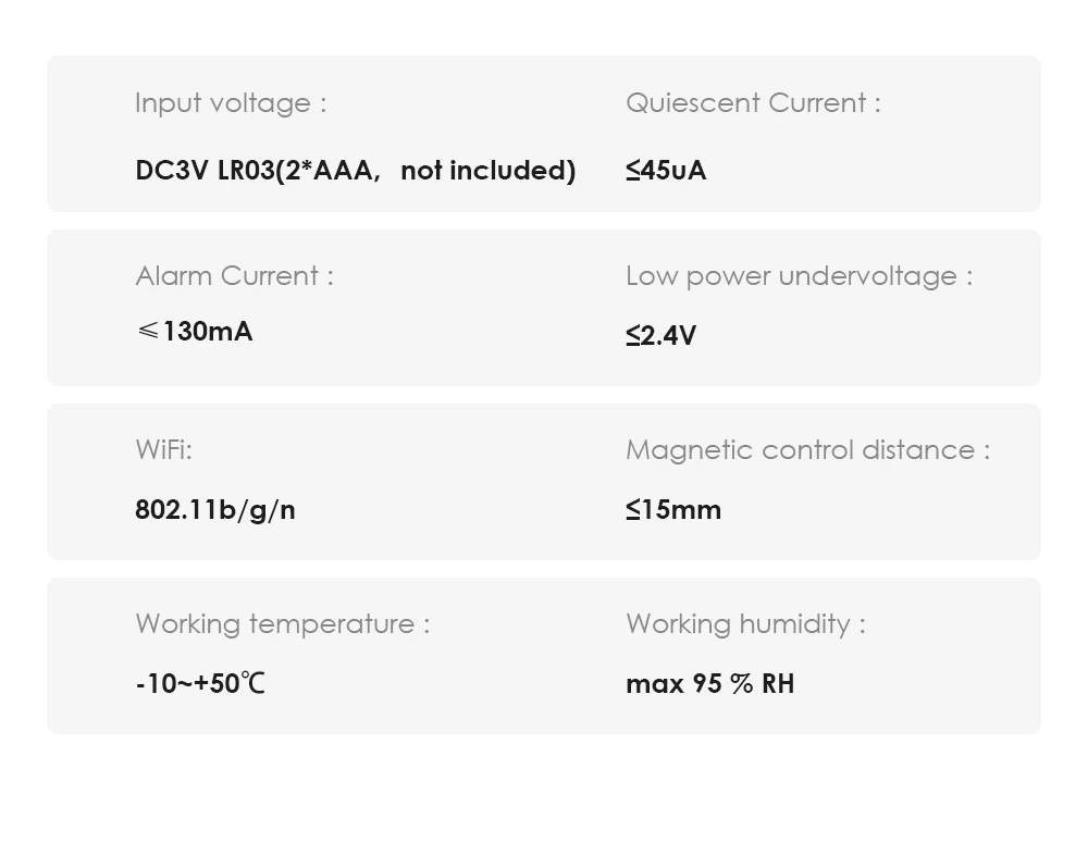 - Mode d’alarme: notification par application de téléphone portable (Smart Life/Tuya Smart)