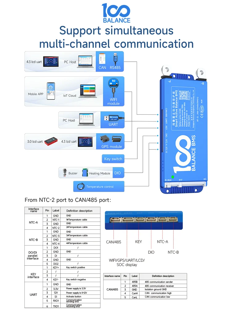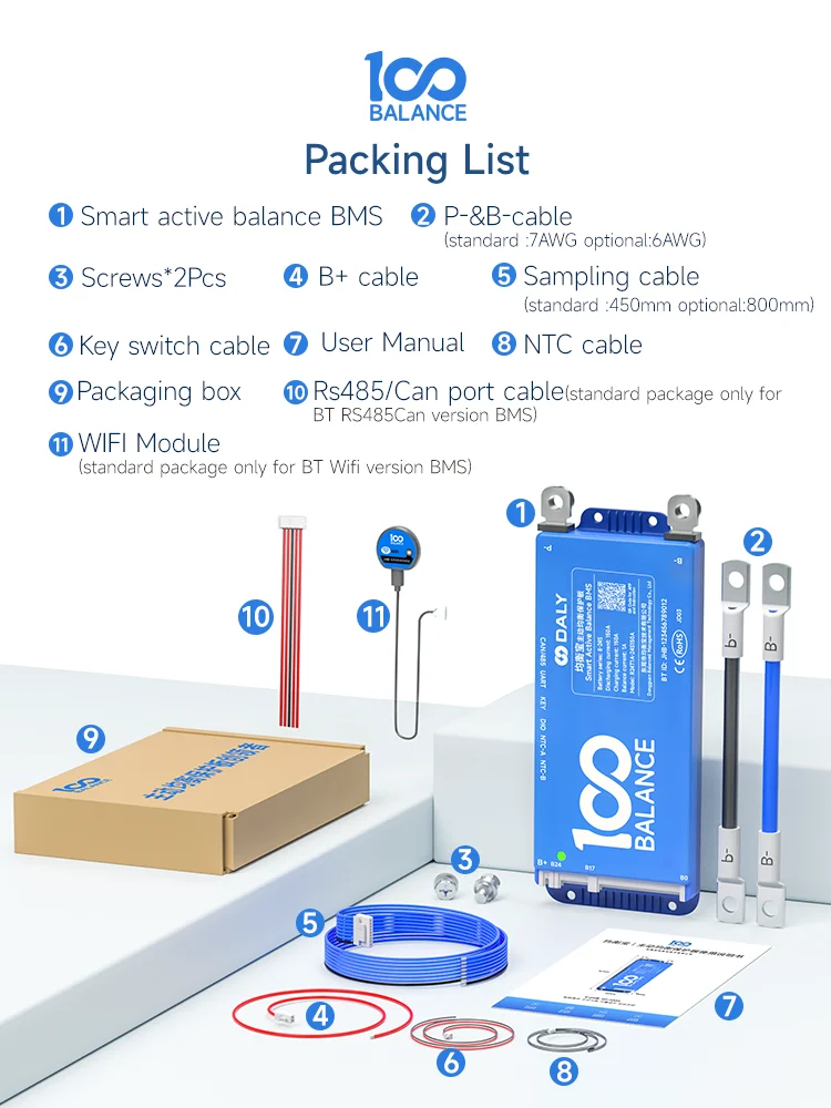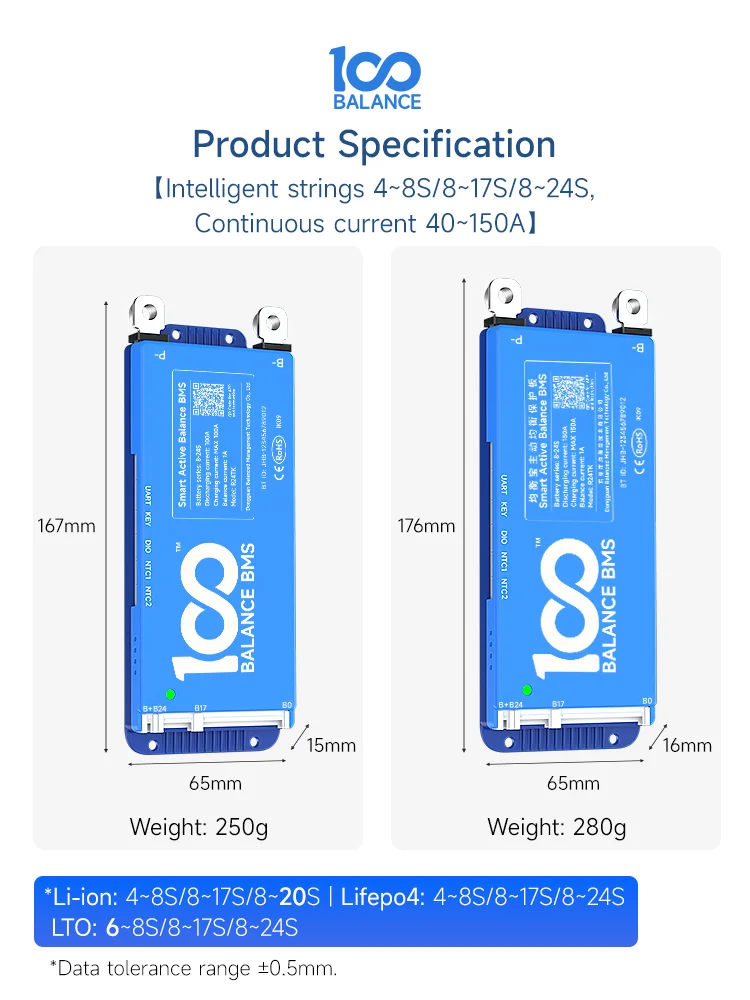 - Balance active intelligente BMS avec une chaîne compatible de 4-8S, 8-17S, 8-24S et un courant de 40-150A.