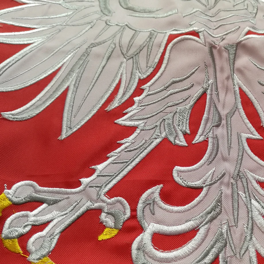 | Type | Banderole brodée et cousue, avec deux œillets en laiton. |