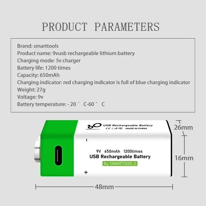 Cette batterie aste 9V est dotée d’une capacité de 650mAh, ce qui lui confère une longue autonomie. Elle est compatible avec les appareils utilisant une batterie 9V et peut être rechargée via un câble micro USB.
