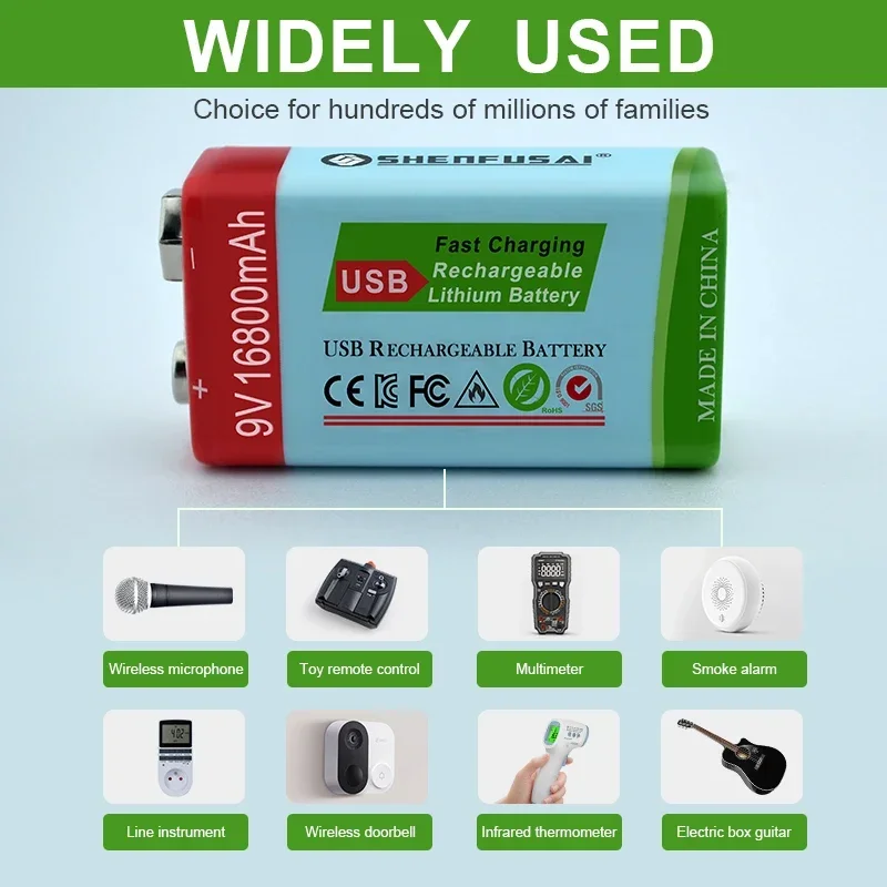 La batterie rechargeable lithium-ion 9V 16800mAh est une batterie USB miniature qui peut être utilisée pour différentes applications comme le multimètre, KTV, microphone, et la télécommande de jouets. Cette batterie carrée rechargeable au lithium a une large gamme d’utilisations dans des domaines tels que les hélicoptères RC, les jouets, les microphones, les interphones, les masseurs, les détecteurs de métal, les détecteurs de fumée et les guitares électriques.