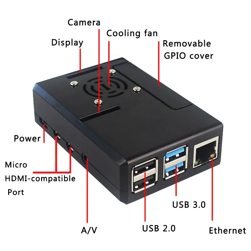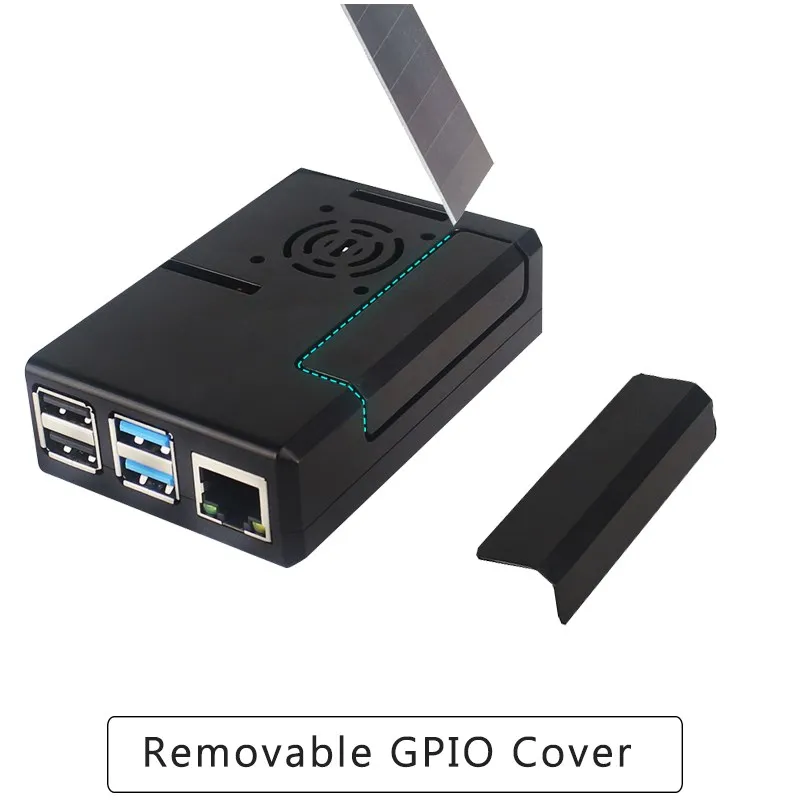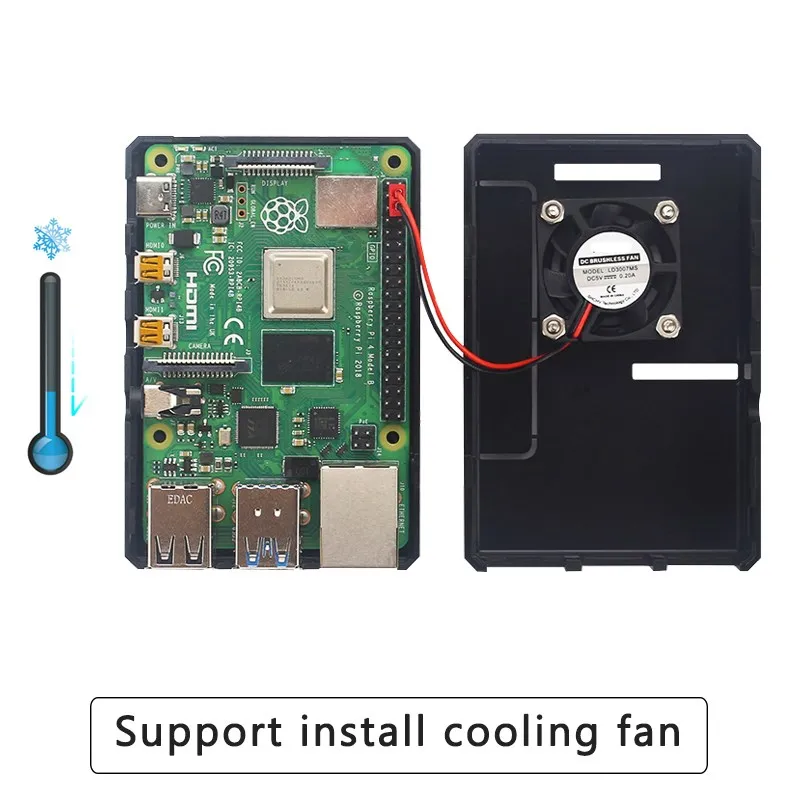 | Coque | Boîtier en plastique ABS avec tous les ports réservés pour Raspberry Pi 4, support d’installation du ventilateur de refroidissement, couvercle GPIO amovible |