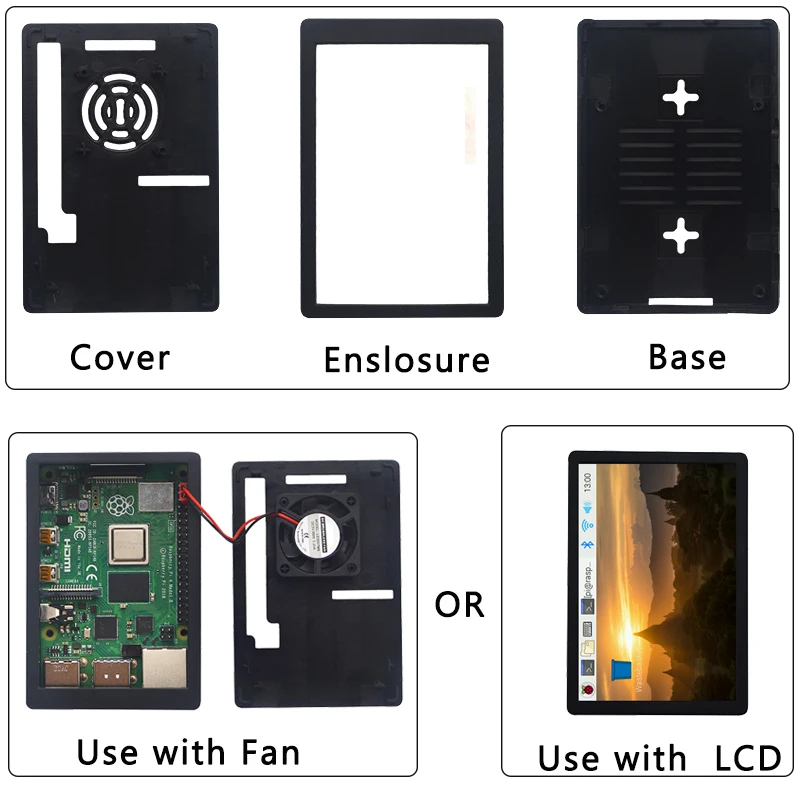 Il s’agit du boîtier à double usage ABS pour Rapberry Pi 4. Vous pouvez utiliser le ventilateur de refroidissement sur ce boîtier, ou utiliser l’écran tactile de 3.5 pouces (version GPIO) dessus.