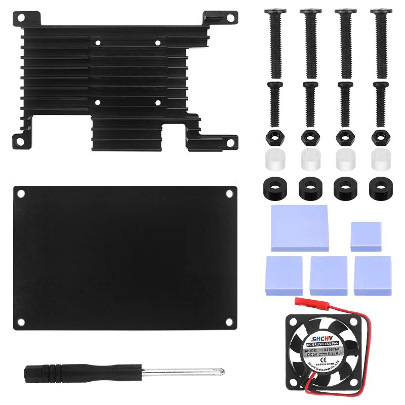 | Liste d’emballage | – 1 couvercle en alliage d’aluminium – 1 base en alliage d’aluminium – 1 ventilateur de refroidissement – 1 jeu de tampons de conduction thermique en silicone – 1 jeu de vis x écrous – Ne comprend pas Orange Pi 4 LTS |