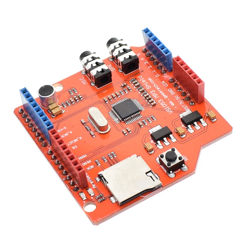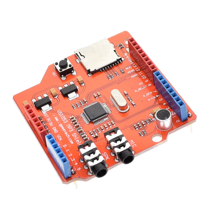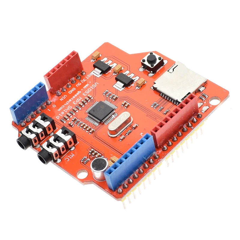 Ce bouclier audio stéréo MP3 est basé sur VS1053B de VLSI. Il permet de brancher directement pour ARDUINO UNO/MEGA sans avoir besoin de pulls. Il est conçu pour faciliter la lecture de musique par rapport à une petite carte de dérivation MP3. Le VS1053 est un processeur de codec MP3 polyvalent capable de décoder une variété de formats de musique, y compris Ogg Vorbis/MP3/AAC/WMA/MIDI audio. Il est également capable d’enregistrer au format Ogg Vobis. Le bouclier dispose également d’un emplacement pour carte TF, ce qui permet de jouer des fichiers MP3 directement depuis une carte TF.