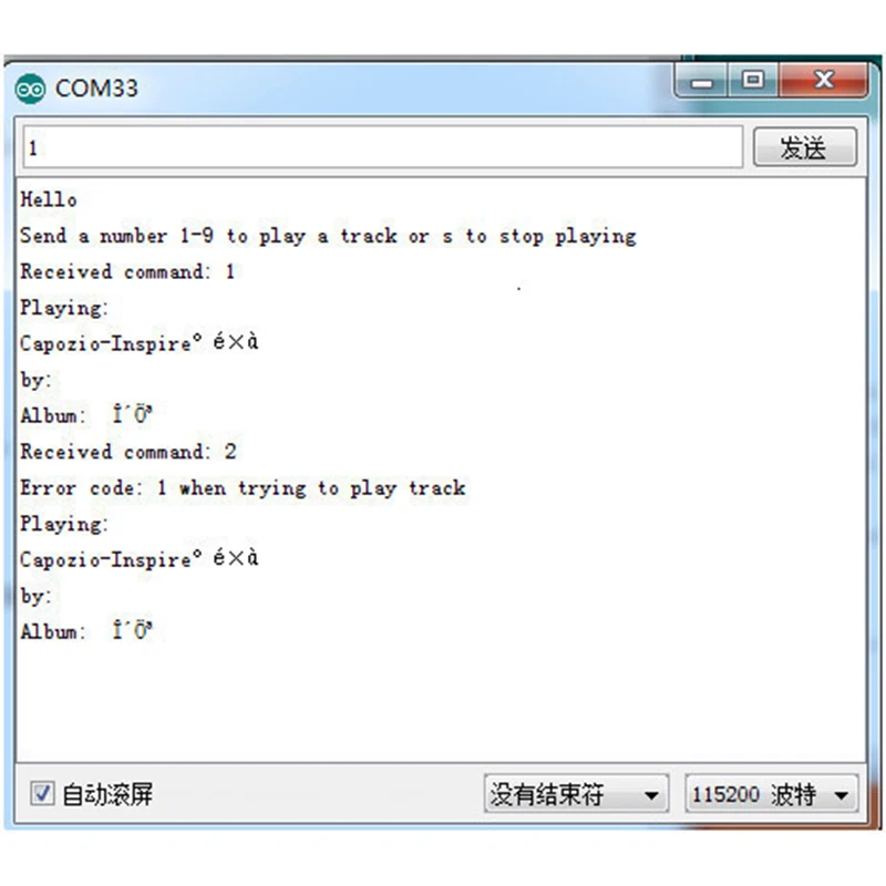- Entrez un numéro (1 à 9) dans la zone d’envoi correspondant au fichier “track00x.mp3”. Vous devriez entendre la chanson correspondante.