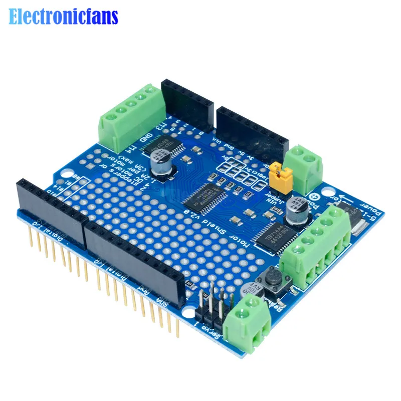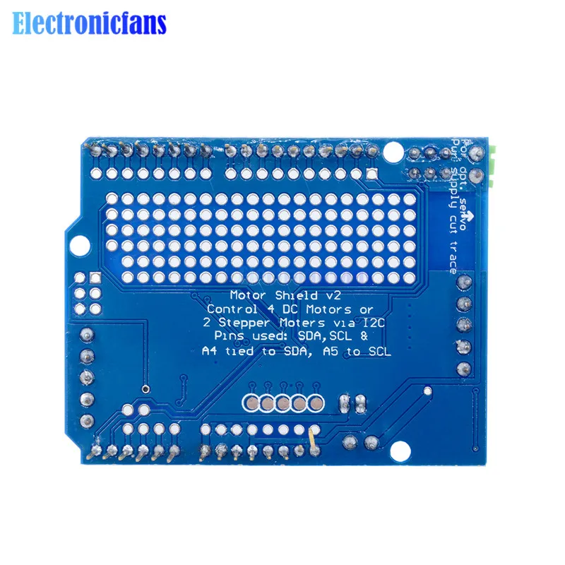 Le bouclier est empilable et dispose de 5 broches de sélection d’adresse, ce qui permet de connecter jusqu’à 32 boucliers empilables. Cela permet de contrôler jusqu’à 64 moteurs pas à pas ou 128 moteurs à courant continu.