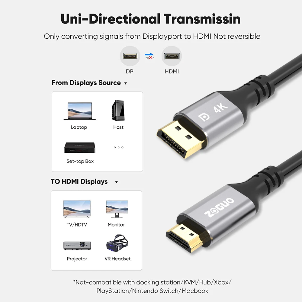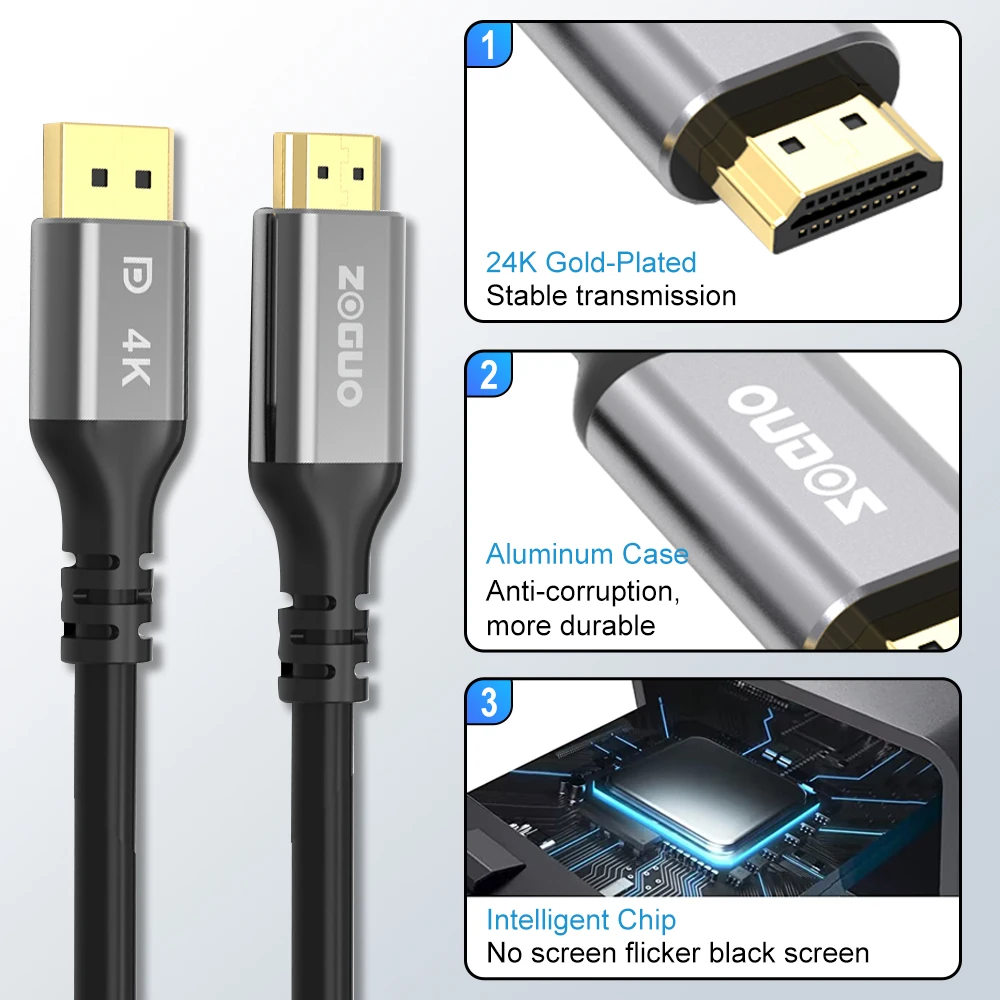 Le câble ZOGUO DP vers HDMI permet de transmettre des signaux vidéo et audio haute définition depuis votre ordinateur vers un téléviseur HD. Ce câble offre une expérience d’utilisation remarquable sans aucun problème visuel ou audio. Il est conçu pour fonctionner de manière unidirectionnelle, convertissant la source DisplayPort en écran HDMI.