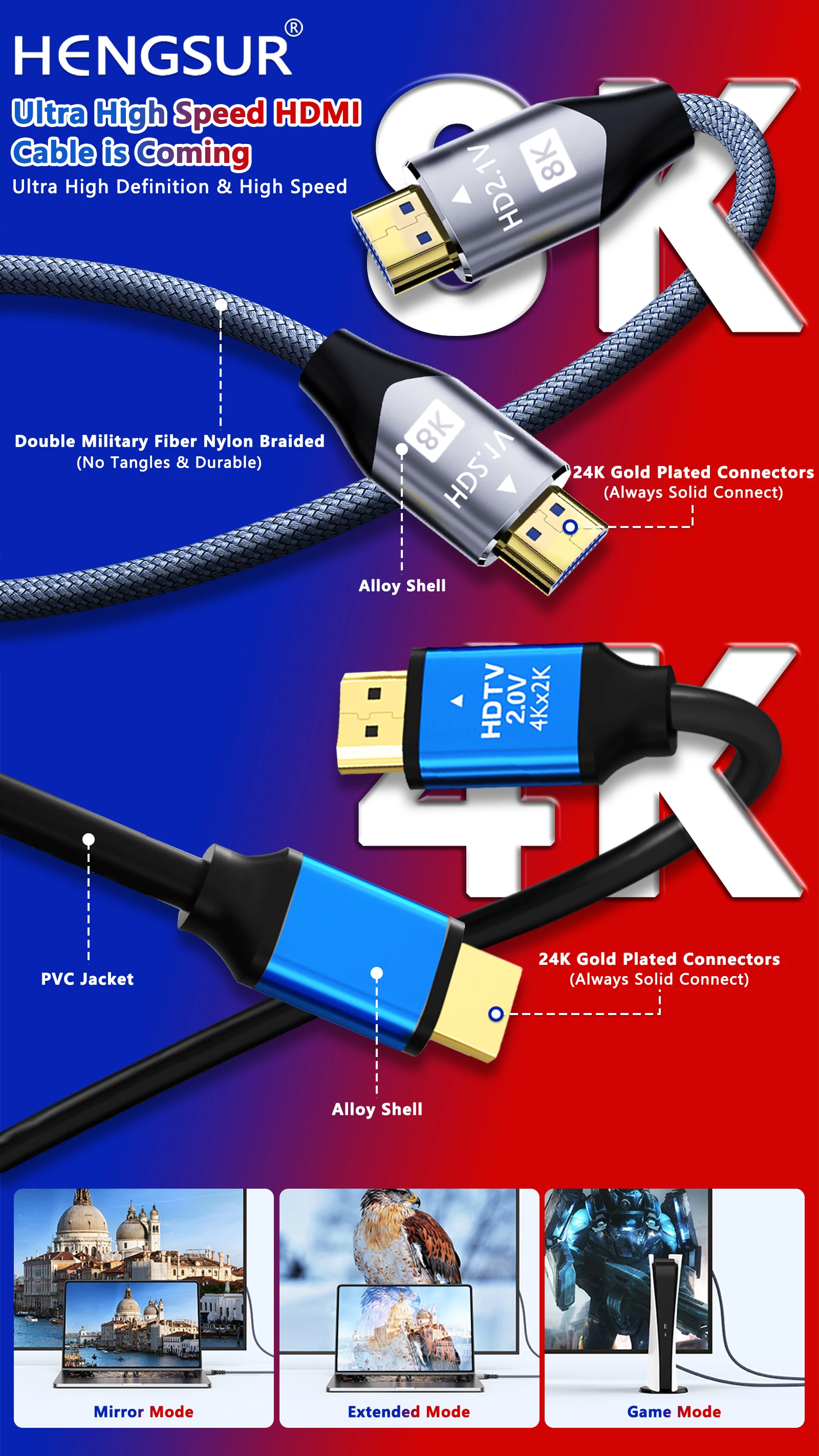 Ce câble HDMI 8K avec une nouvelle puce intelligente, lui permet d’atteindre une hauteur sans précédent. Il peut garantir une transmission à grande vitesse sans perte de signal. La résistance de la coque en alliage d’aluminium et la conception anti-flexion de la queue ont été améliorées. Grâce à la technologie SR, la partie de la prise est toujours en matériau plaqué or 24K, qui transmet avec précision les signaux. Le matériau en nylon de traction de qualité militaire prolonge également considérablement sa durée de vie.