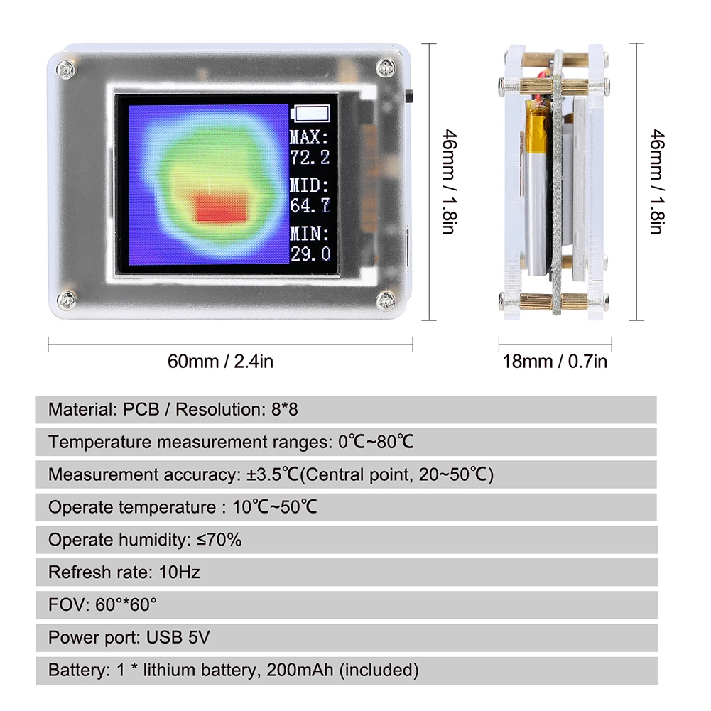 La caméra d’imagerie thermique AMG8833 est un outil puissant pour la vérification de l’électronique. Avec son écran TFT 1.8 pouces, elle vous permet de voir les images clairement et de vivre une meilleure expérience. La plage de mesure de température est de 0 à 80 ℃, ce qui répondra à tous vos besoins. De plus, sa taille portable la rend facile à transporter, vous pourrez l’emporter partout où vous en avez besoin.