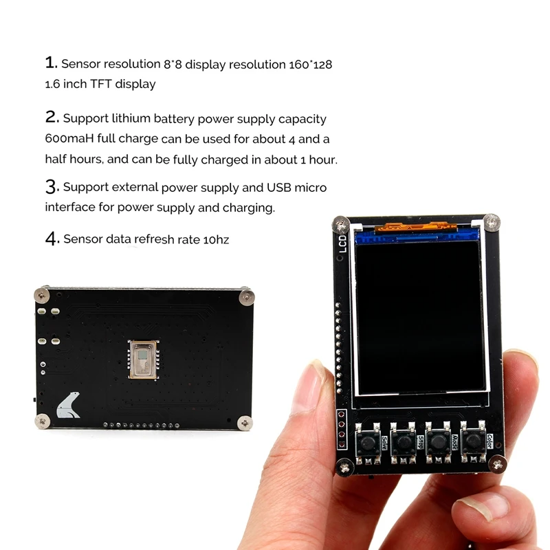Le Cycleur thermique infrarouge AMG8833 est un dispositif d’imagerie thermique qui utilise des capteurs de température pour détecter les variations de température dans son environnement. Avec un écran d’affichage TFT de 1.6 pouces, il offre une expérience d’utilisation améliorée en affichant les données de manière claire. Le rapport de résolution des capteurs est de 8×8, ce qui permet une détection précise jusqu’à une distance maximale de 7m. Ce dispositif prend en charge la carte TF pour stocker les captures d’écran et permet également de les visualiser. La plage de température mesurée par les capteurs est de 0 à 80 °C, avec une erreur de +/- 3 °C. Les valeurs maximales et minimales sont affichées à 0 degrés pour indiquer les écarts. Le Cycleur thermique infrarouge AMG8833 est alimenté par une batterie au lithium de 600mAh et est livré dans une taille compacte de 65x43x15mm.