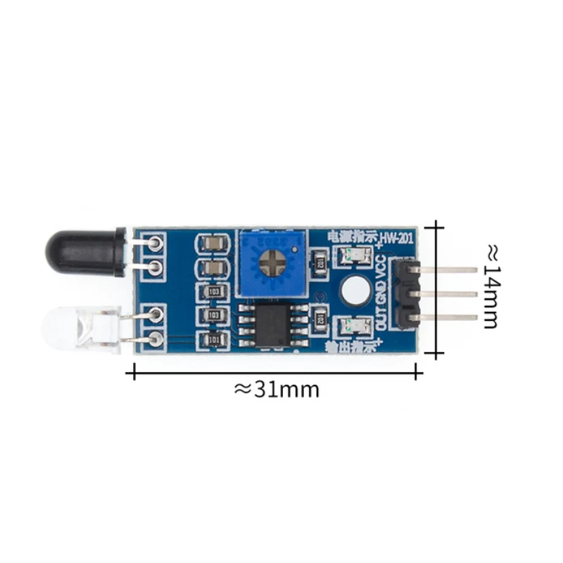 | Description du module | Le module de capteur adaptable à la lumière ambiante, ayant une paire de tubes émetteurs et récepteurs infrarouges, les tubes émetteurs émettent infrarouge certaine fréquence, lorsque la direction d’un obstacle est détectée (surface de réflexion), l’infrarouge réfléchi est reçu par le tube de réception, après un traitement de circuit de comparateur, le voyant vert est allumé. Mais l’interface de sortie du signal produit un signal numérique (un signal de bas niveau). Vous pouvez ajuster le potentiomètre du bouton de distance de détection, la plage de distance effective de 2 ~ 30cm, la tension de fonctionnement de 3.3V-5V. La plage de détection du capteur peut être obtenue en ajustant le potentiomètre, avec peu d’interférence, facile à assembler, fonctionnalités faciles à utiliser, peut être largement utilisé dans l’évitement d’obstacles de robot, voiture d’évitement, comptage de ligne, et suivi de ligne noir et blanc et beaucoup d’autres occasions. |