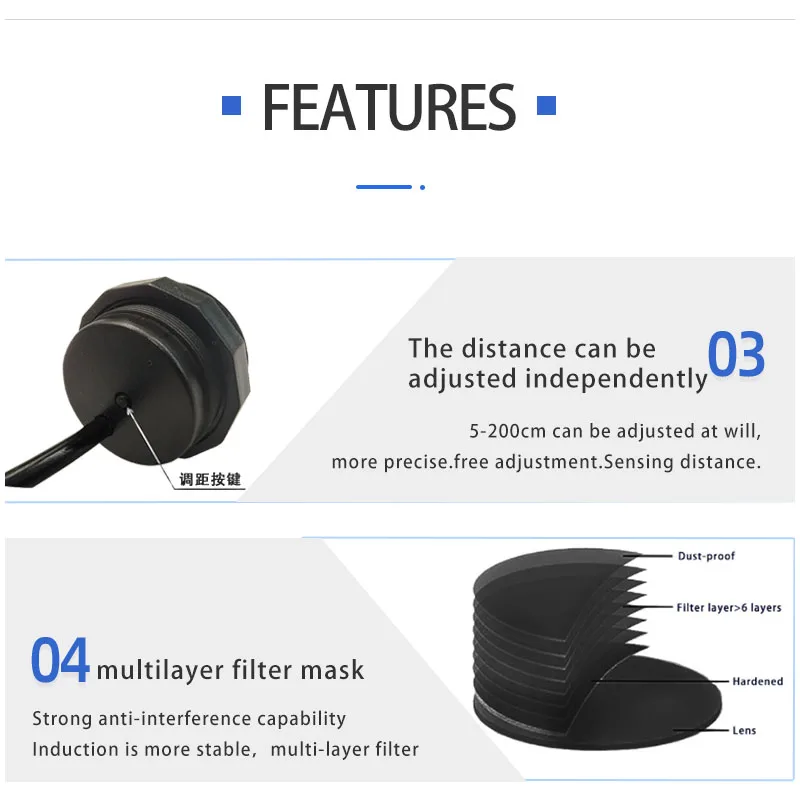 Le capteur XKC-KE200 peut être utilisé pour diverses applications telles que l’alarme de sécurité, la lumière de capteur, la poubelle intelligente, la boîte à lumière miroir, la machine publicitaire, la polisseuse à chaussures, le distributeur d’eau, le distributeur automatique, le robinet, le pommeau de douche et autres fonctions. Il intègre l’émission infrarouge, la réception et le contrôle intelligent, avec des performances stables et fiables.