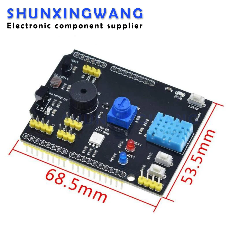 | Fonctionnalités | Module de bouton à 2 voies, module LED à 2 voies, module LED couleur, module récepteur IR, module capteur de luminosité, module capteur de température LM35D, module buzzer passif, module potentiomètre rotatif, module de capteur de température et d’humidité DHT11 |
