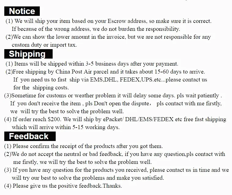 Si vous avez un problème avec le produit, la livraison, le service, veuillez nous contacter, nous vous répondrons à temps, veuillez ne pas laisser de commentaires négatifs et ouvrir directement un litige.