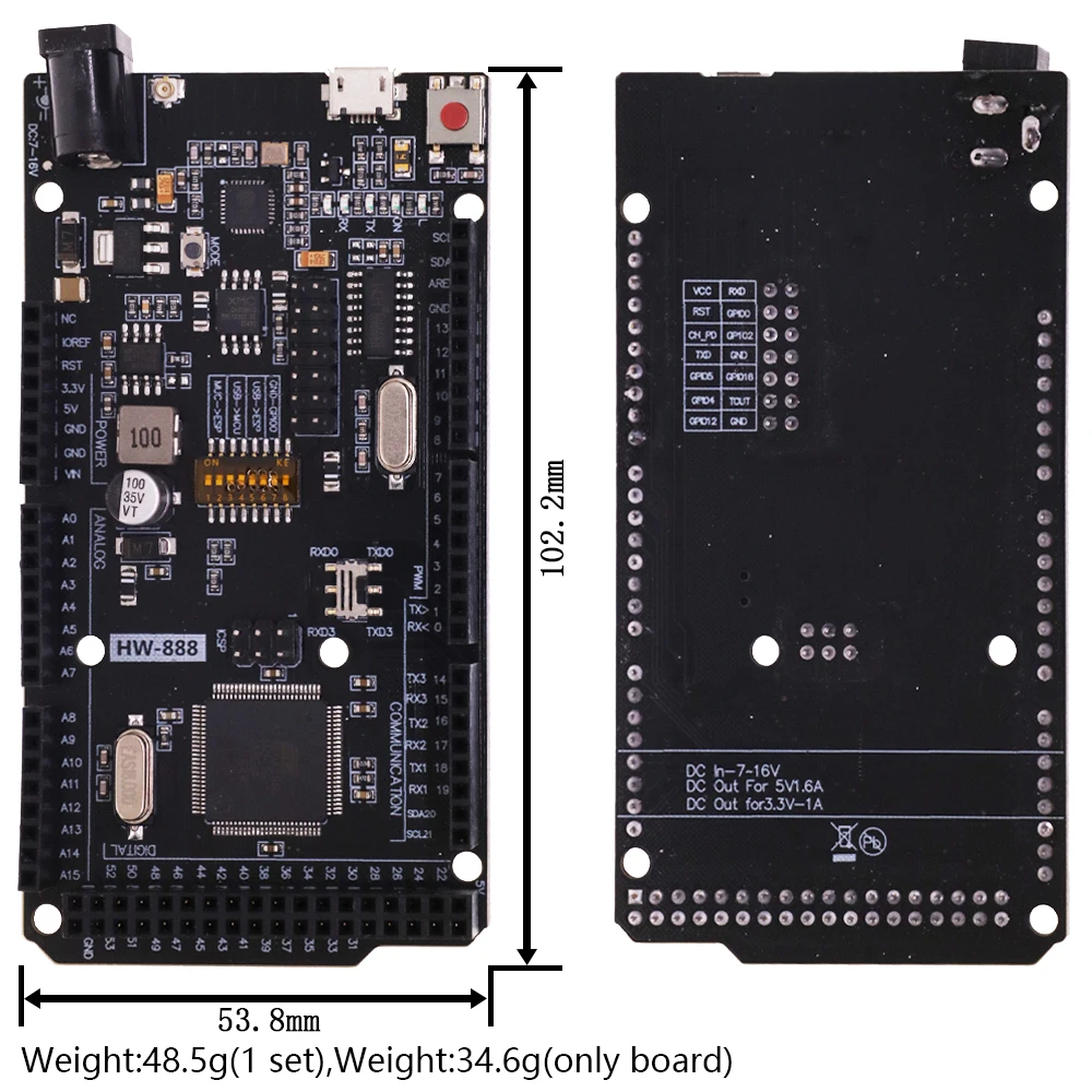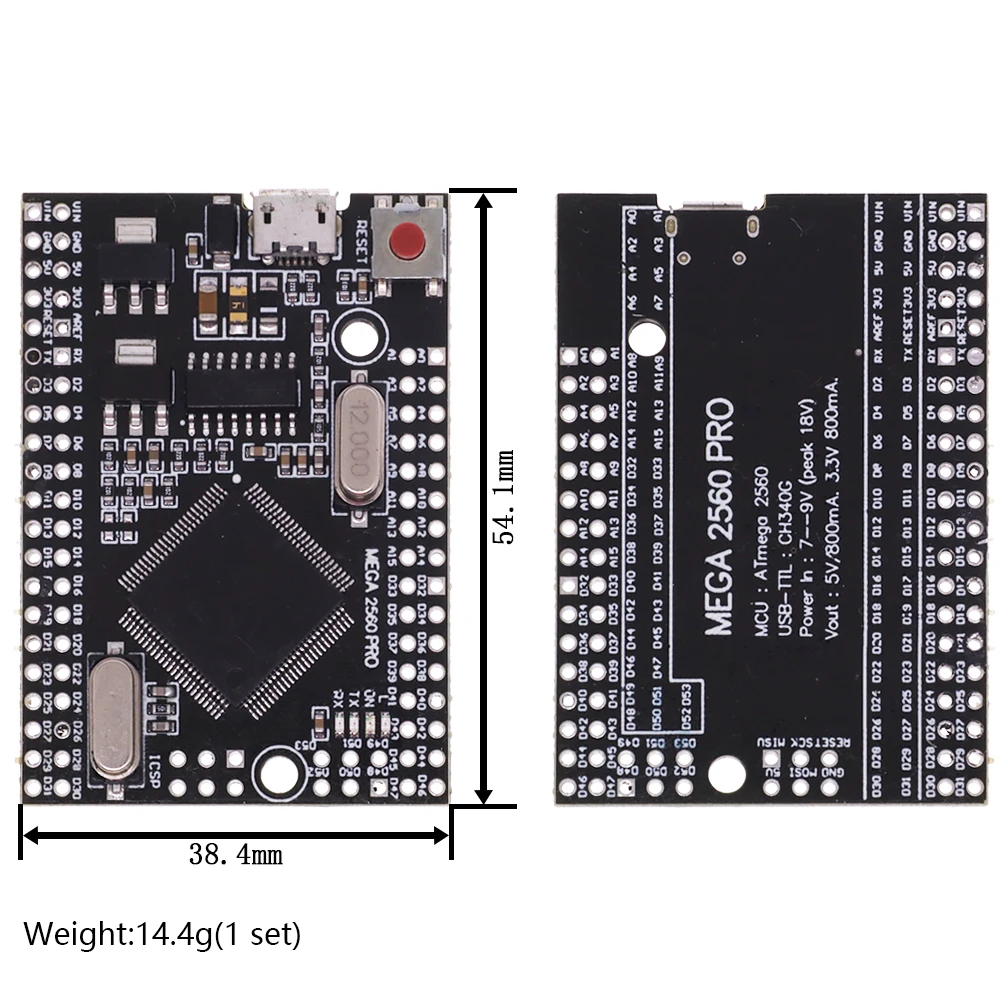 - Broches d’E/S numériques: 54 (dont 15 fournissent une sortie PWM)