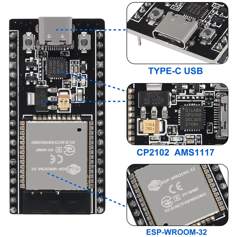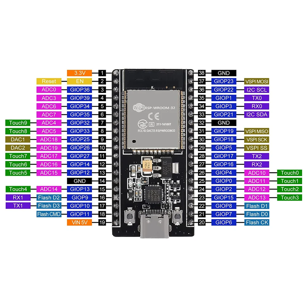 Cette carte de développement ESP32 de Type C est un module innovant qui offre de nombreuses fonctionnalités et avantages. Elle dispose d’une interface USB type-C et de 38 broches, ce qui la rend compatible avec une grande variété d’applications.