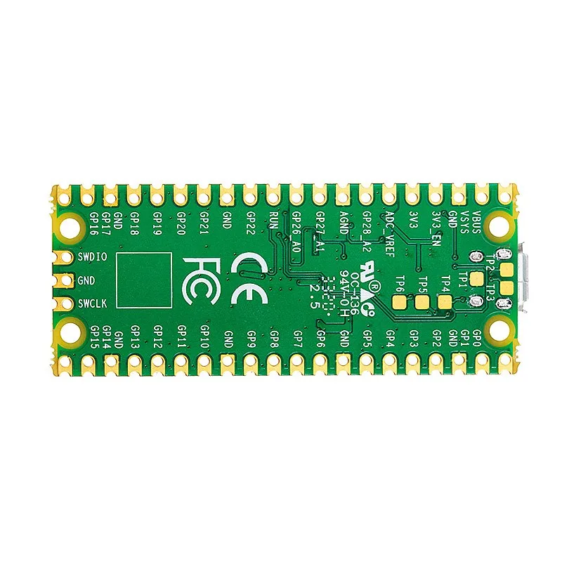 La Raspberry Pi Pico RP2040 dispose de 26 broches GPIO multifonctions, 2 interfaces SPI, 2 interfaces I2C, 2 interfaces UART, 3 ADC 12 bits et 16 canaux PWM contrôlables.