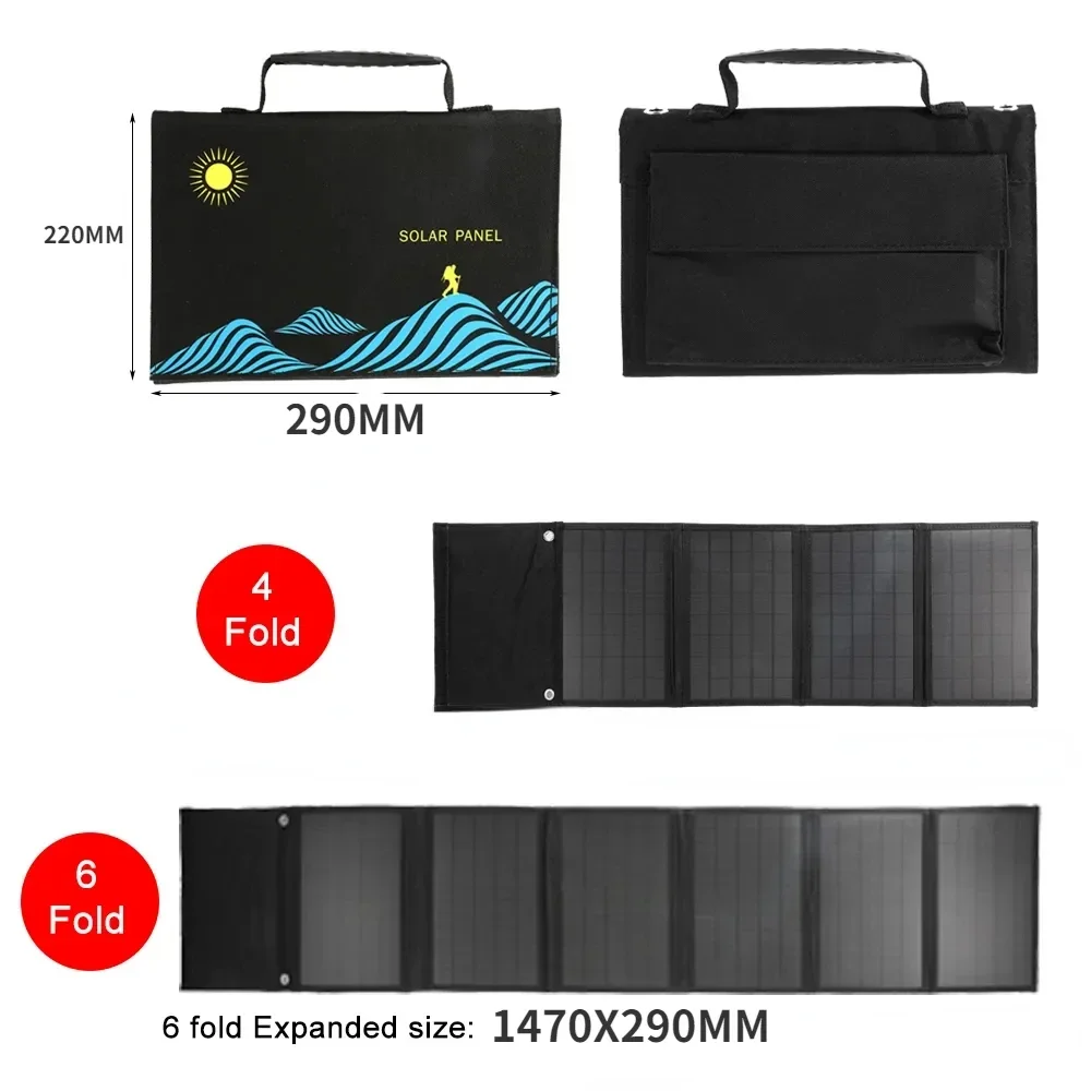 Le panneau solaire est intégré en 4 ou 6 parties, ce qui permet de le plier de manière compacte et d’obtenir une