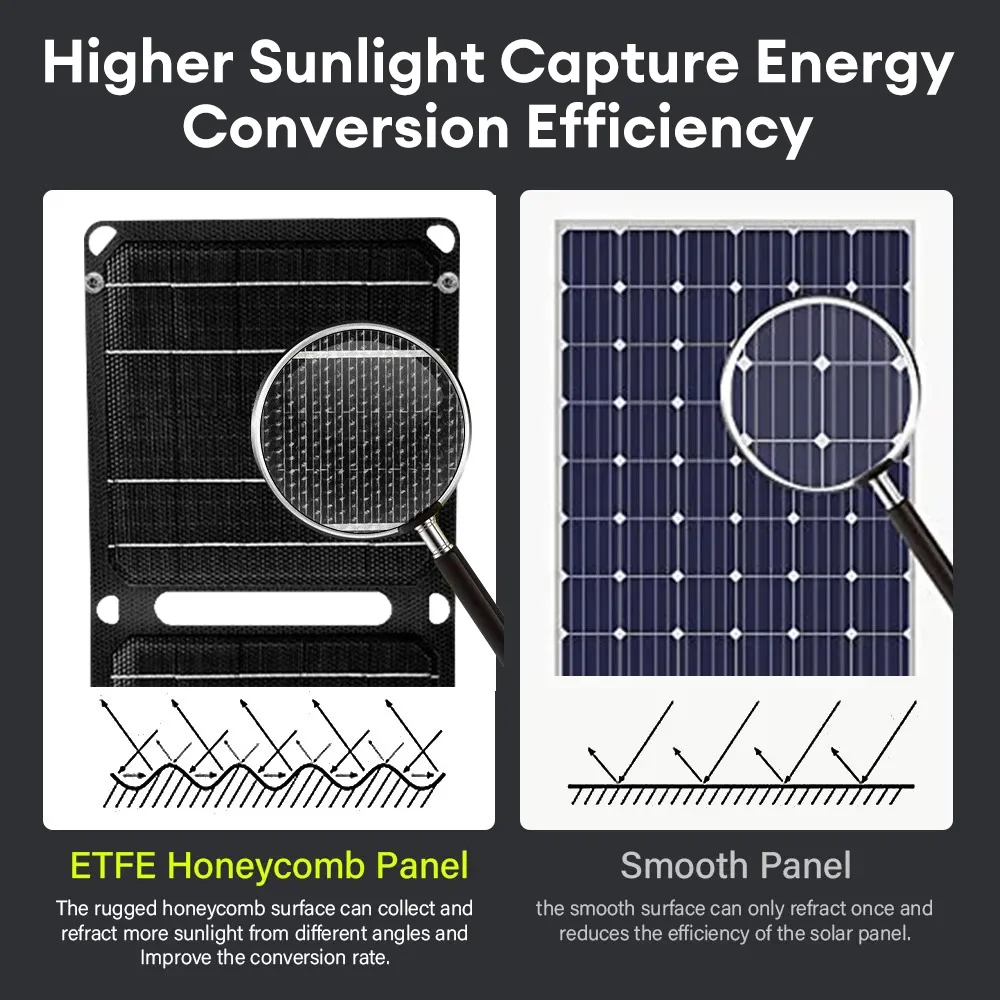 Le panneau solaire est fait de cellules solaires monocristallines de haute qualité. Il est 100% étanche et est protégé par un film matériau ETFE qui prolonge sa durée de vie.