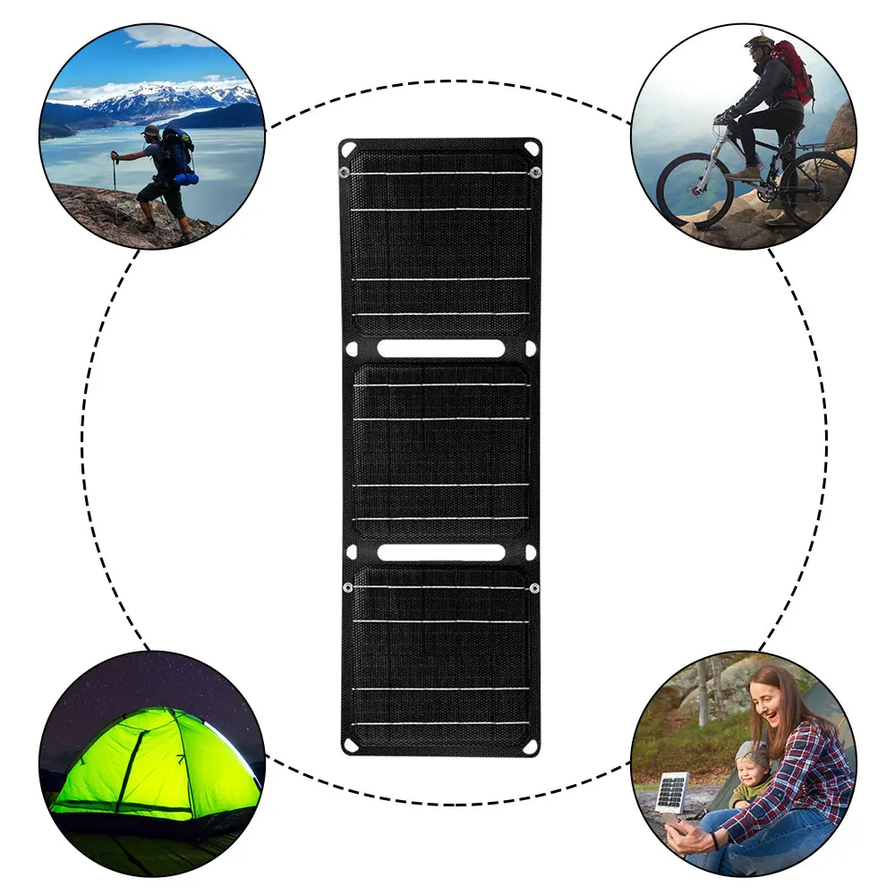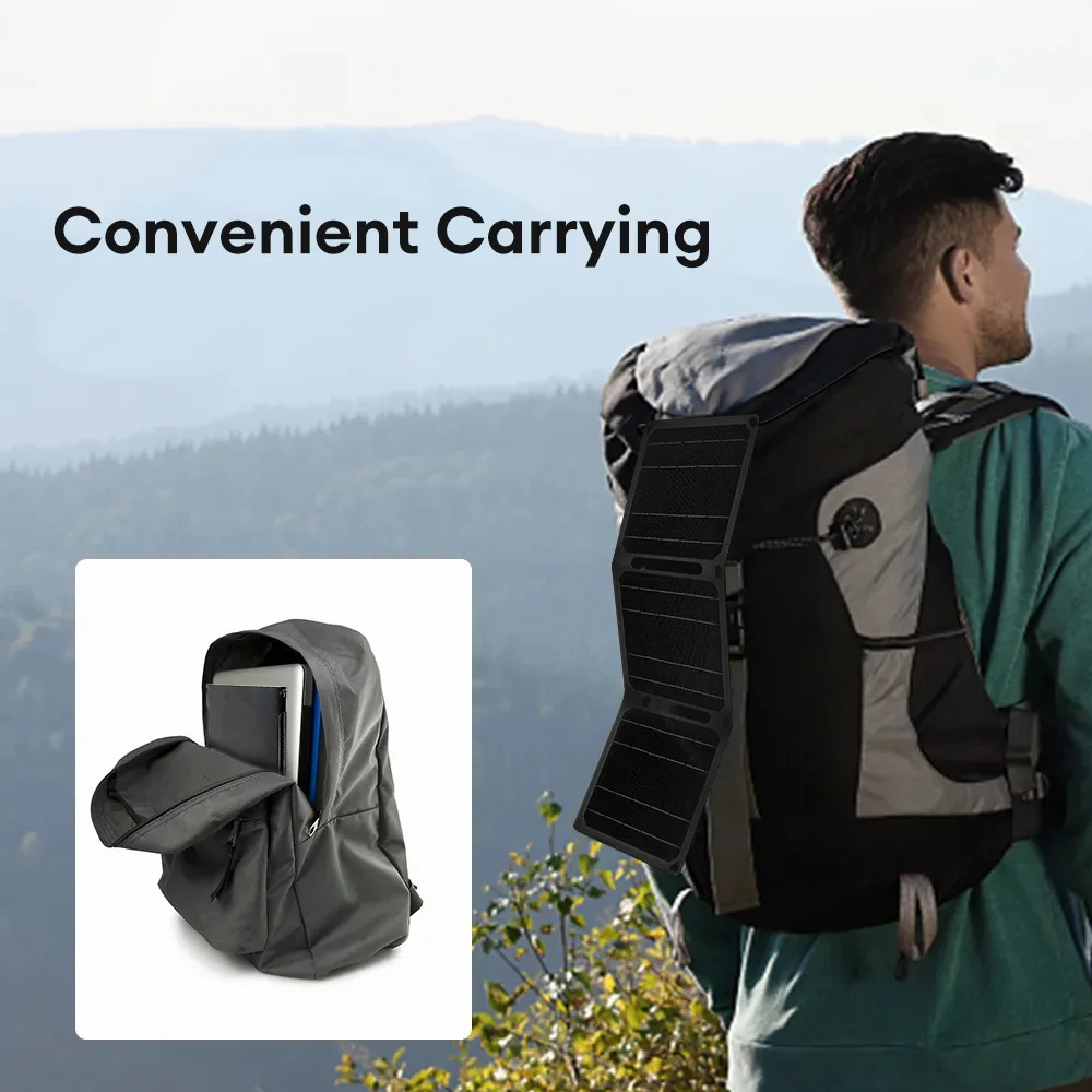 Le panneau solaire portable est spécialement conçu pour être facilement plié et transporté. Il peut être inséré dans n’importe quel sac à dos de camping ou accroché fermement sur le sac à dos, la tente, l’arbre ou le vélo grâce à ses boucles de randonnée.