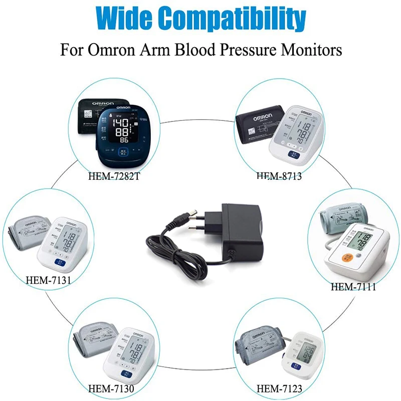 Le chargeur adaptateur universel pour moniteur de pression artérielle est compatible avec les modèles OMRON I-C10, M4-I, M2, M3, M5-I, M7, M10M6 et M6W. Il convient également aux séries BP742 et HEM-741, HEM-7121, HEM-7130, HEM-712, HEM-7122, HEM-752, HEM-745C, HEM-7300, HEM-8102A, HEM-942C et HEM-780N3.