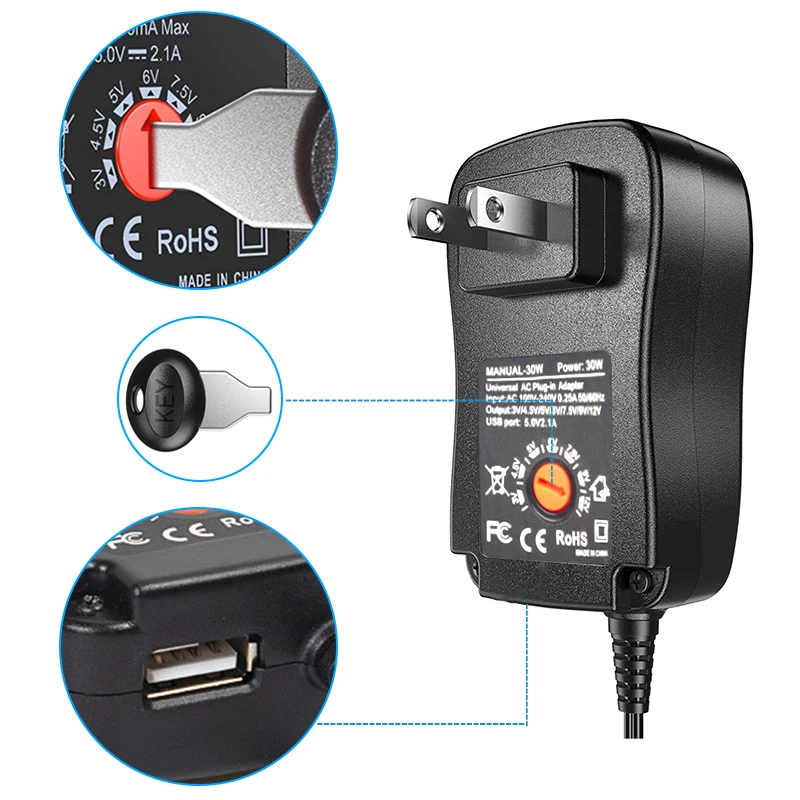 Le chargeur adaptateur secteur universel réglable offre des tensions de sortie de 3V, 4.5V, 5V, 6V, 7.5V, 9V et 12V. Vous pouvez facilement régler la tension correspondante en utilisant la fonction de réglage manuel.