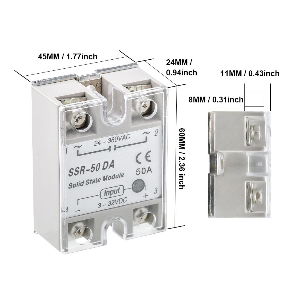 | SSR-50DA | 3-32V DC | 24-380V AC | 50A |