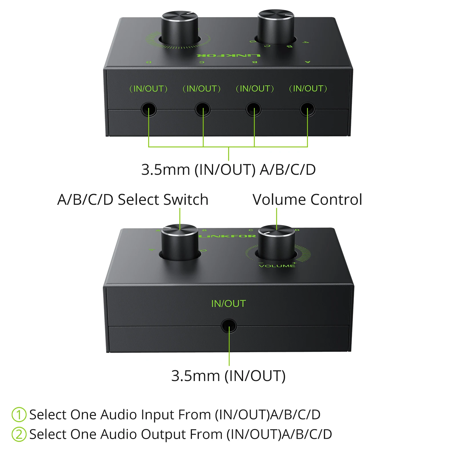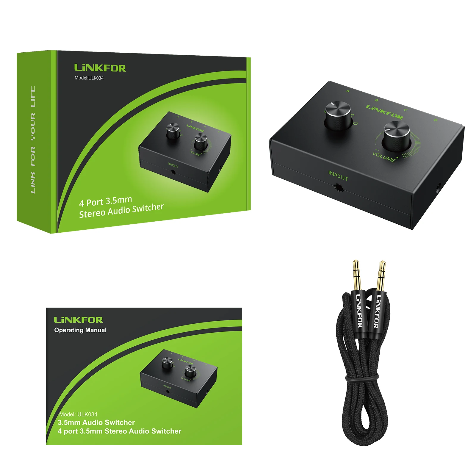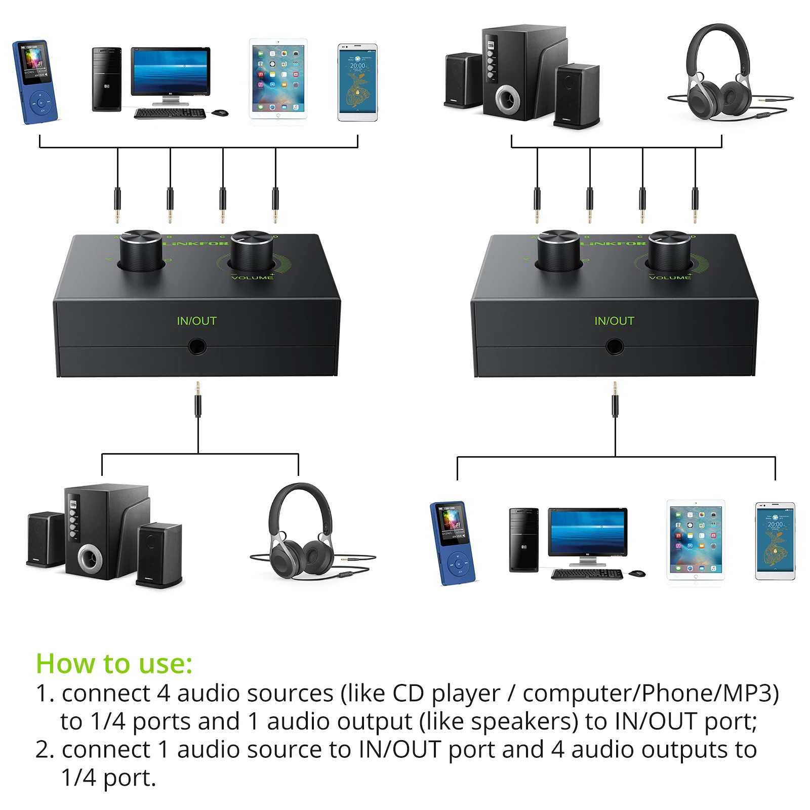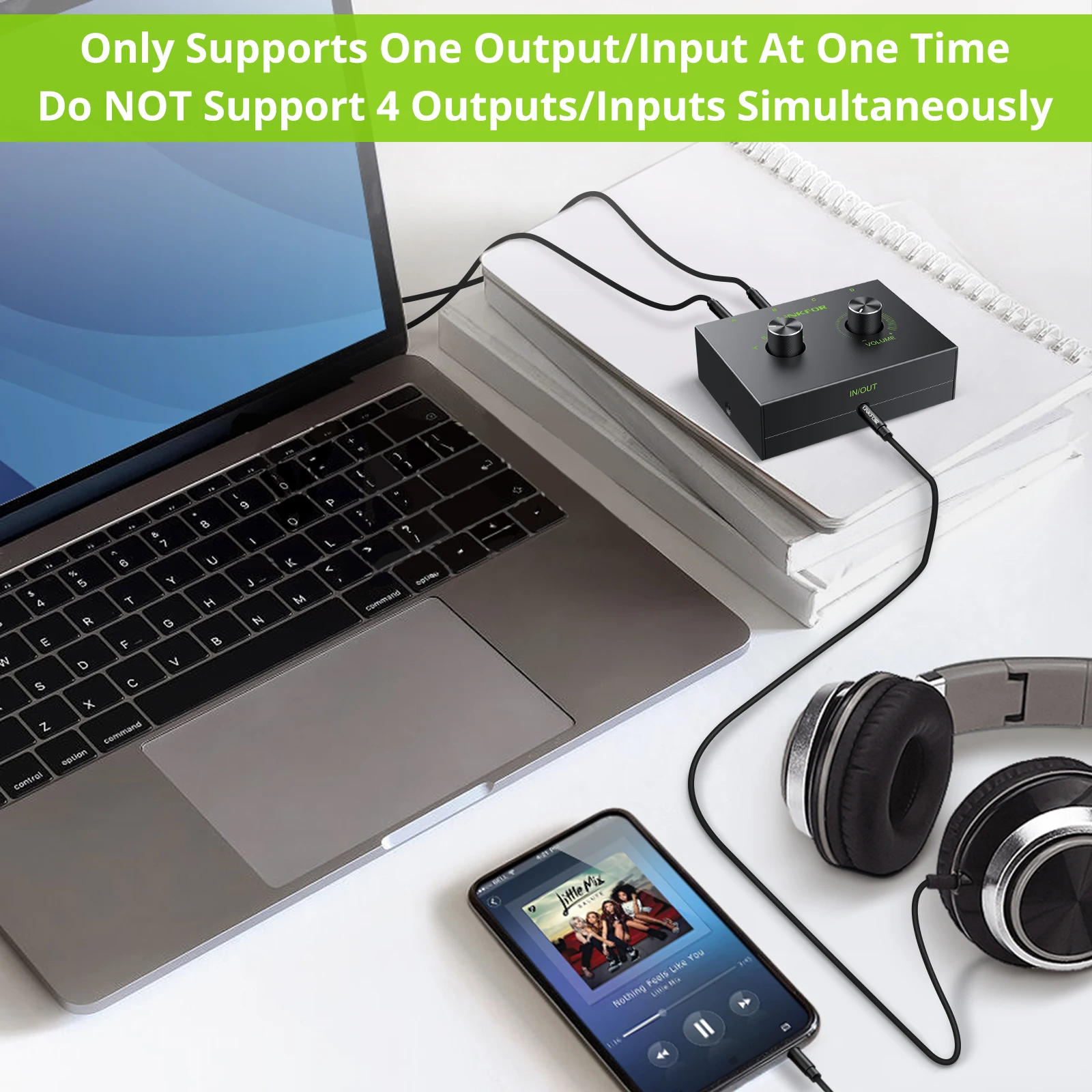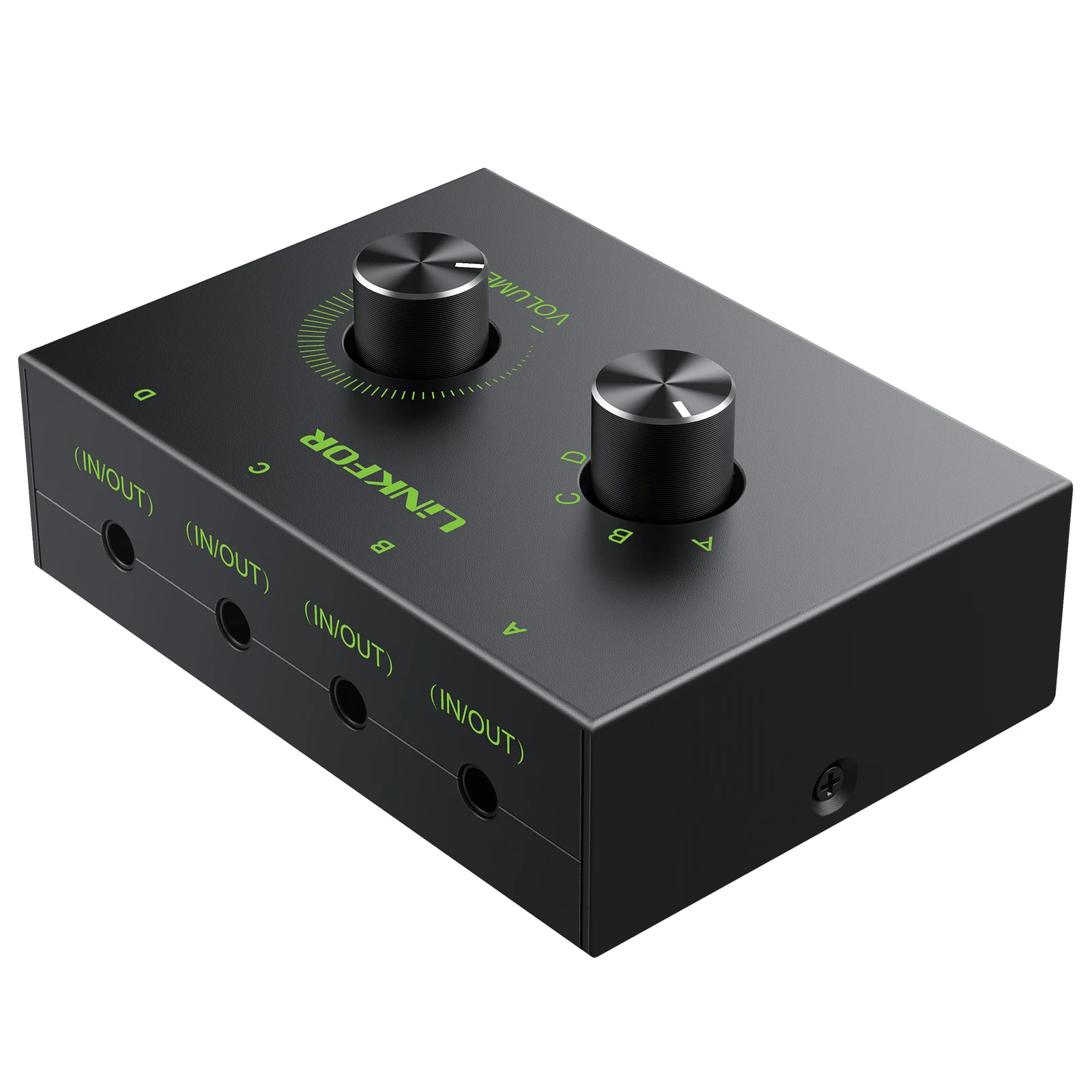 Commutateur audio stéréo 4 ports 3.5mm, commutateur audio 4 voies 3.5mm, aucune alimentation externe requise, sélecteur audio 4 entrées 1 sortie/1 entrée 4 sorties pour haut-parleur passif Casque Sélecteur manuel Boîte répartiteur partage audio