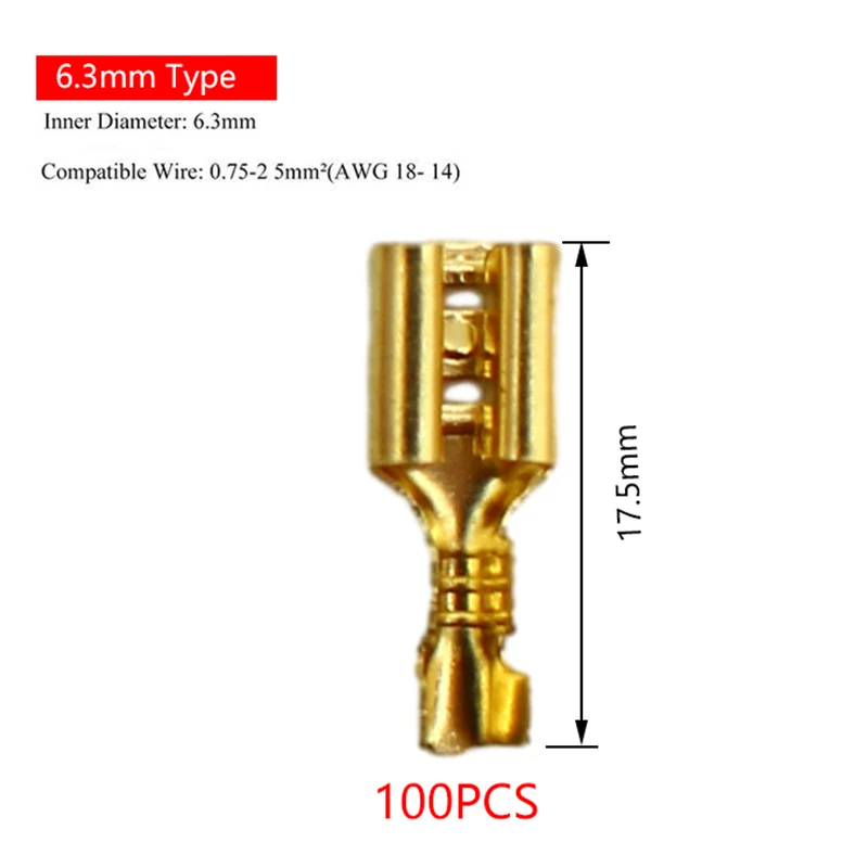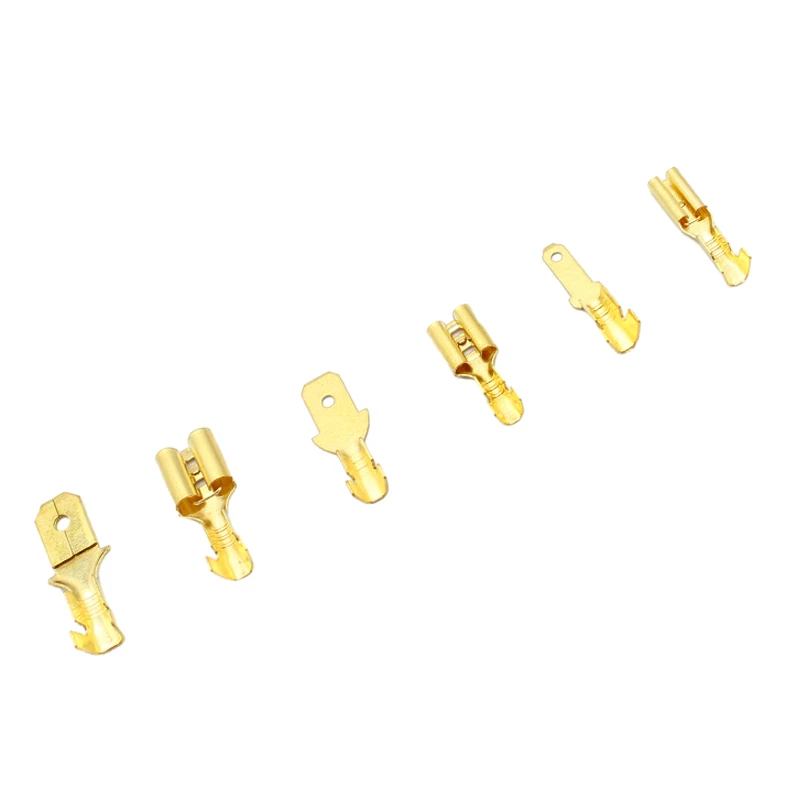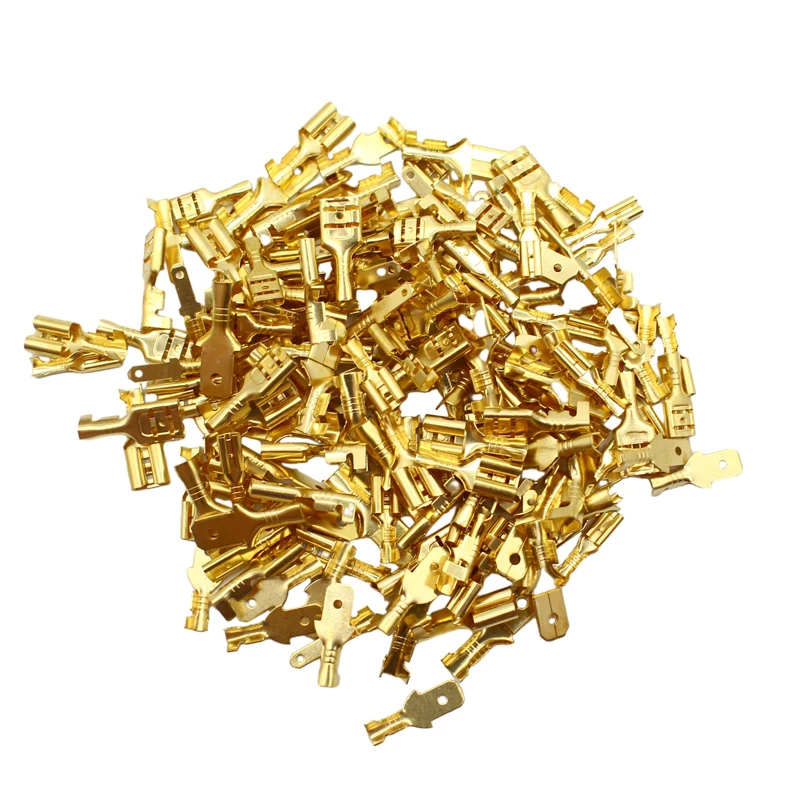 | Laiton | Tone d’or | Le terminal est roulé et la couture est aboutée. Cette couture ne peut pas s’ouvrir dans des conditions normales de tension ou de traction de fil. Conçu avec un barillet à port complet, idéal pour les fils solides ou toronnés difficiles à sertir. Durable et facile à installer. Convient pour la connexion dans le câble d’alimentation avec des équipements électriques. Utilisé largement dans les machines, le courant électrique, le chemin de fer, la construction navale, l’aviation, l’appareil ménager, le haut-parleur, etc. de voiture/bateau. |