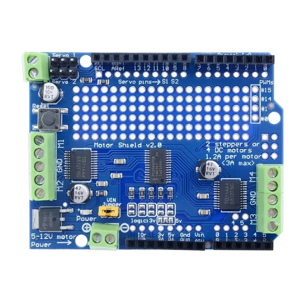 Le jeu de puces TB6612 fournit 1.2A par pont (3A crête) avec protection thermique d’arrêt, diodes internes de protection de rebond. Peut faire fonctionner les moteurs sur 4.5VDC à 13.5VDC.