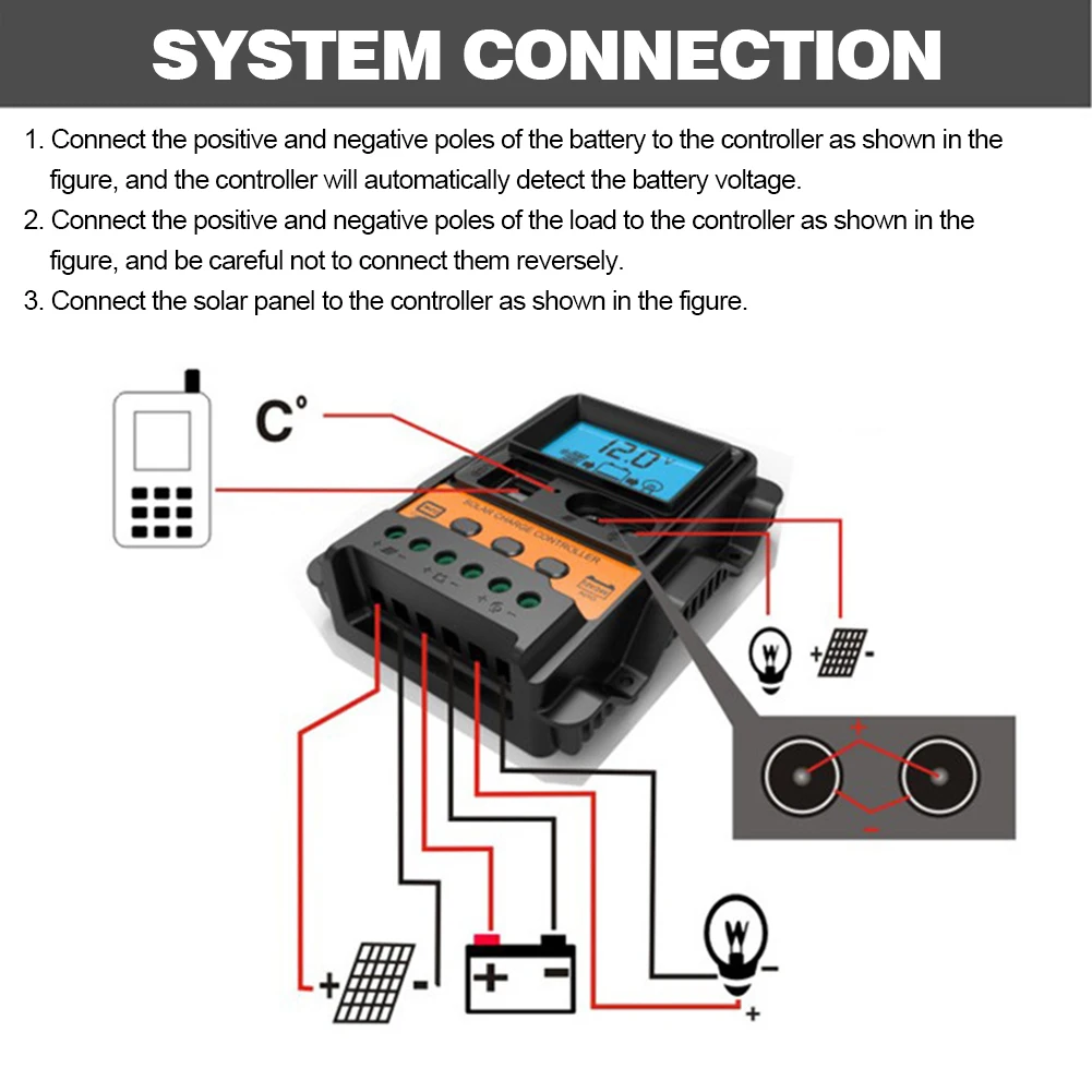 - Ce contrôleur reconnaît automatiquement 12V ou 24V, veuillez vous assurer que la batterie a suffisamment de tension pour que le contrôleur puisse la reconnaître correctement lors de l’installation initiale.