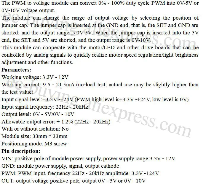 L’alimentation du module est strictement contrôlée dans les 12V. Lorsque la fréquence PWM d’entrée est inférieure à 22Hz et que le rapport cyclique est inférieur à 10%, la sortie peut avoir des problèmes. Par conséquent, lors de l’utilisation, veuillez vous assurer que la fréquence PWM d’entrée est supérieure à 22Hz ou que le rapport cyclique est supérieur à 10%.