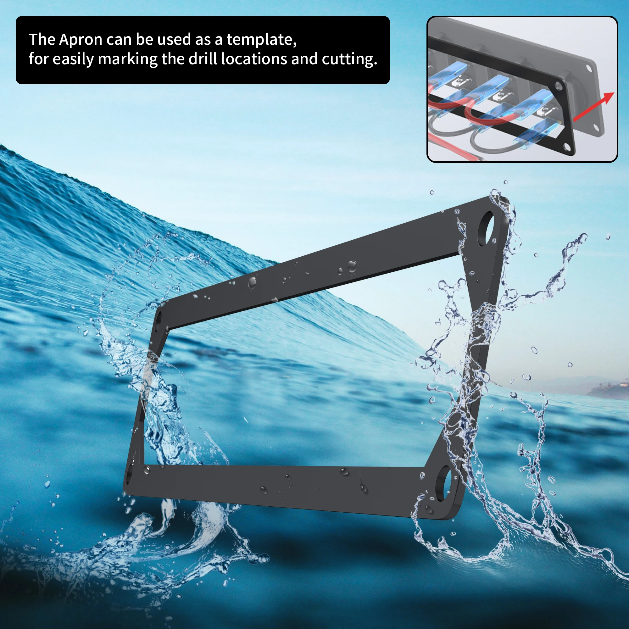 Le panneau d’interrupteurs à 6 voies peut être installé horizontalement ou verticalement. Il est livré avec des vis de montage et un tablier en caoutchouc qui peut être utilisé comme gabarit pour faciliter les emplacements de perçage et de découpe.