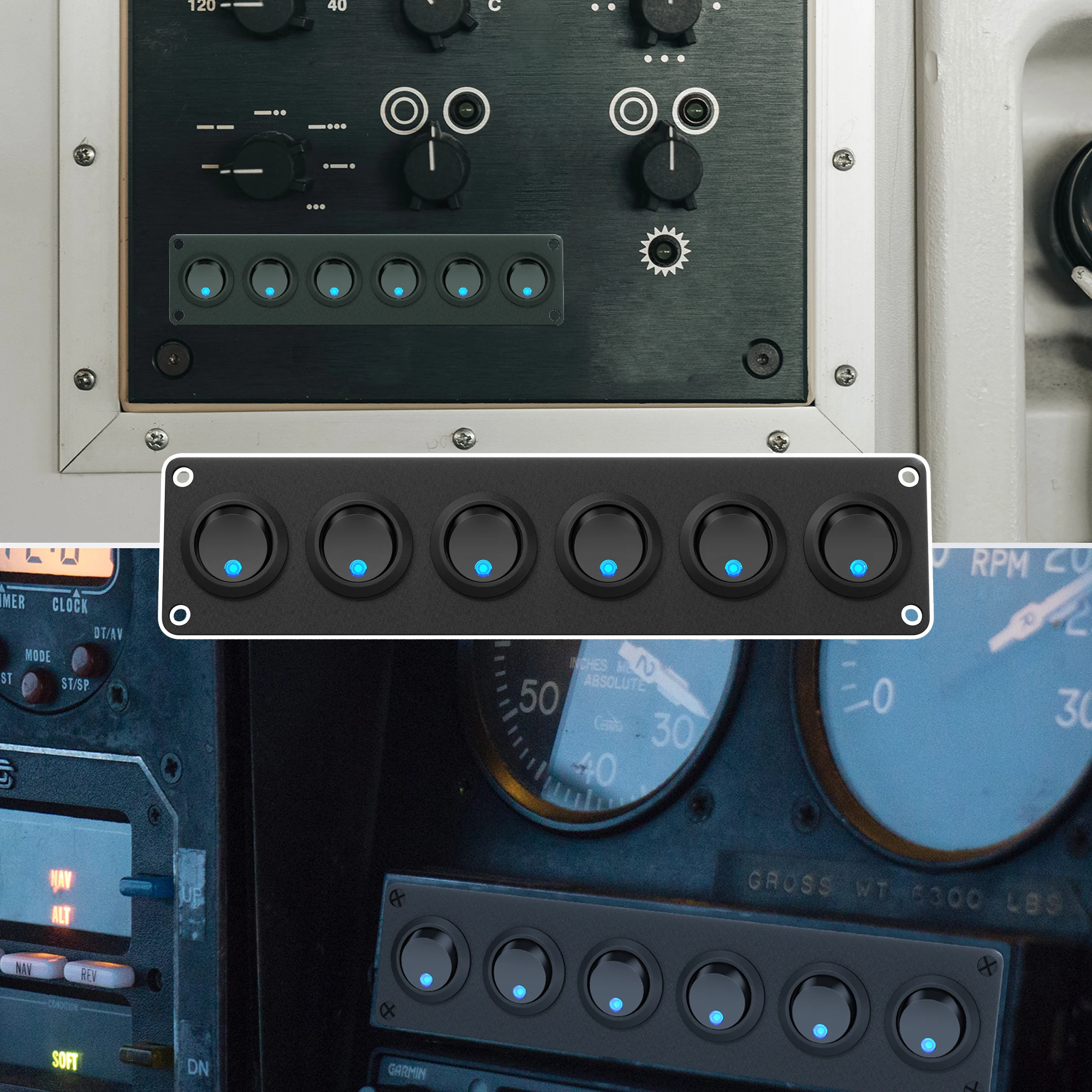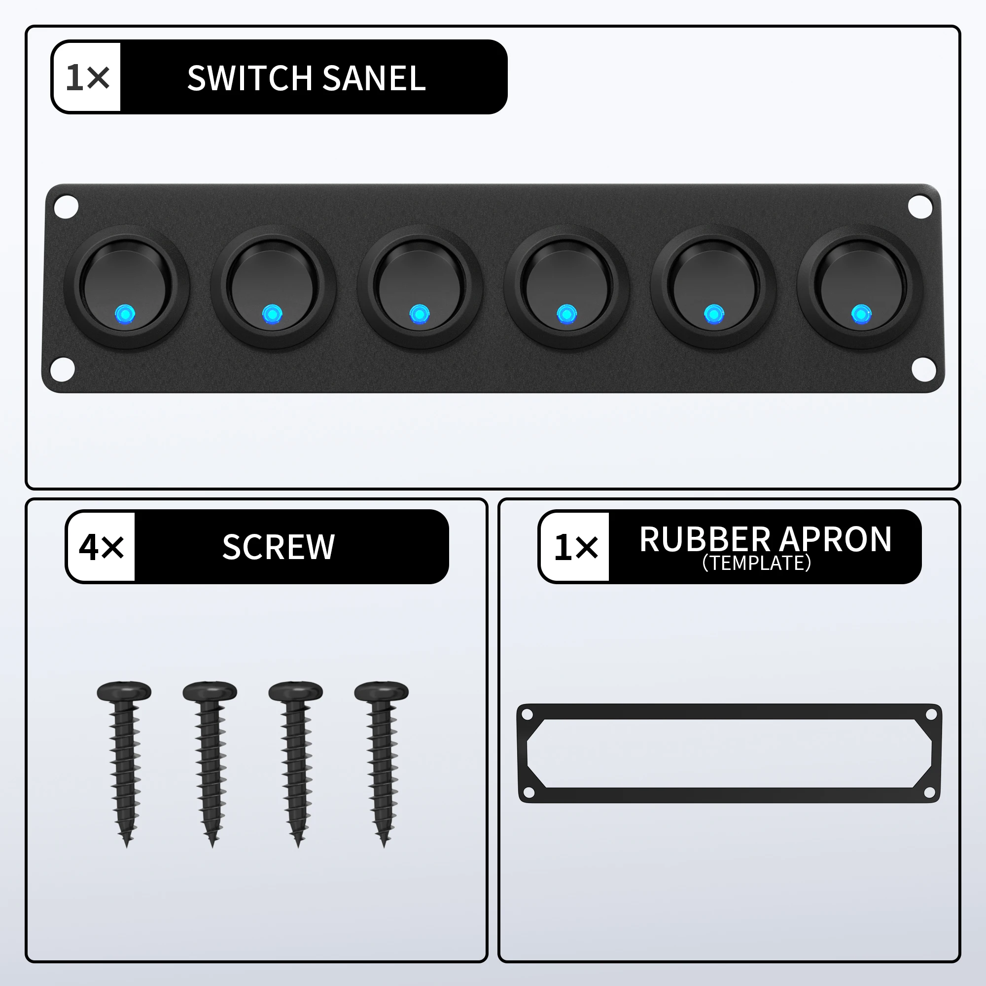 Le panneau d’interrupteurs à bascule 12V comprend un panneau à 6 voies, des vis, un tablier en caoutchouc et une instruction.