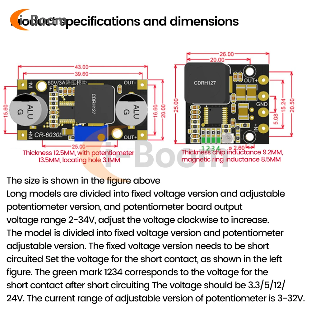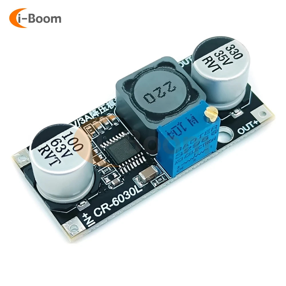 - La plage de tension de sortie de la carte du potentiomètre est de 2 à 34V, et la tension augmente en l’ajustant dans le sens des aiguilles d’une montre