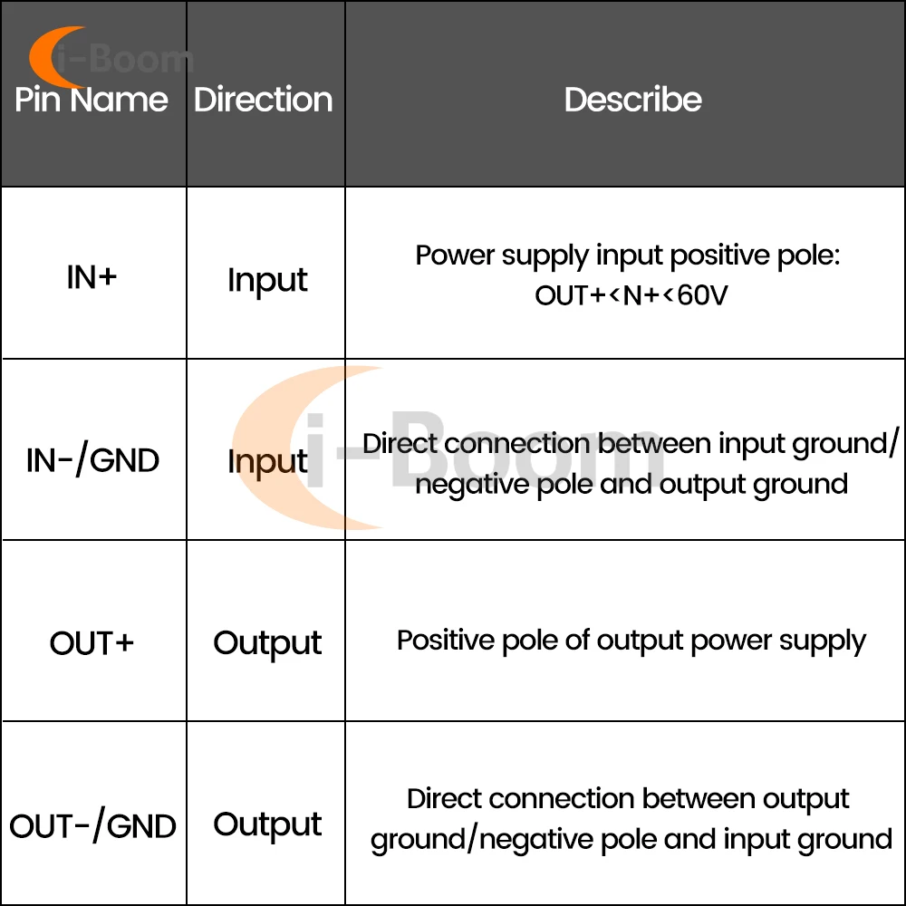 - Plage de tension d’entrée : 4.2V-60V, mais si le courant est élevé, il devrait être supérieur à la tension de sortie de plus de 1V